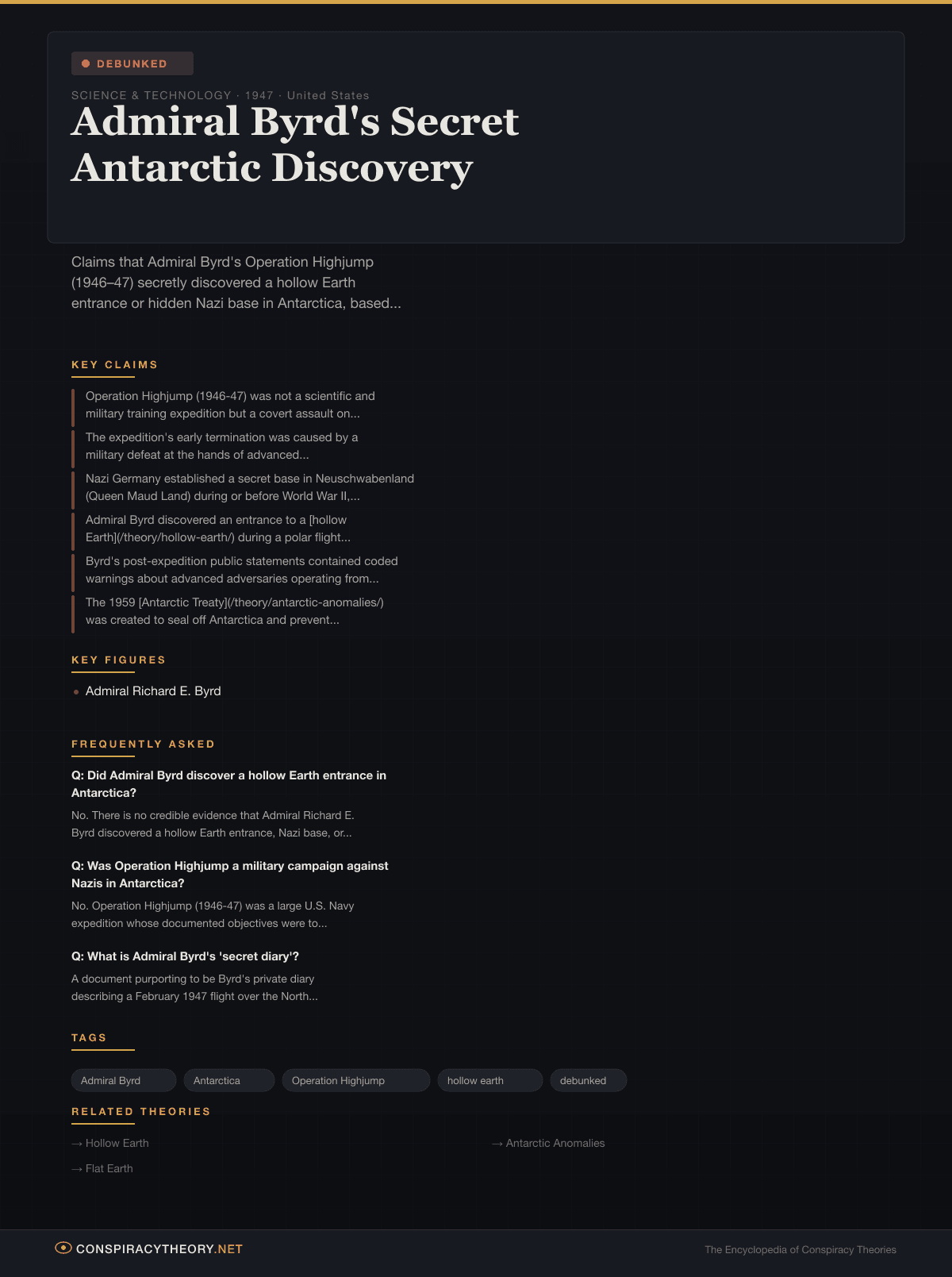 The Admiral Byrd Antarctic conspiracy has become one of the most durable narratives in the overlapping worlds of hollow Earth theory, Nazi occultism, and UFO lore. It functions as a nexus point connecting multiple conspiracy traditions: the idea of a surviving Fourth Reich, the hollow Earth hypothesis, ancient advanced civilizations, and government cover-ups of extraordinary discoveries.