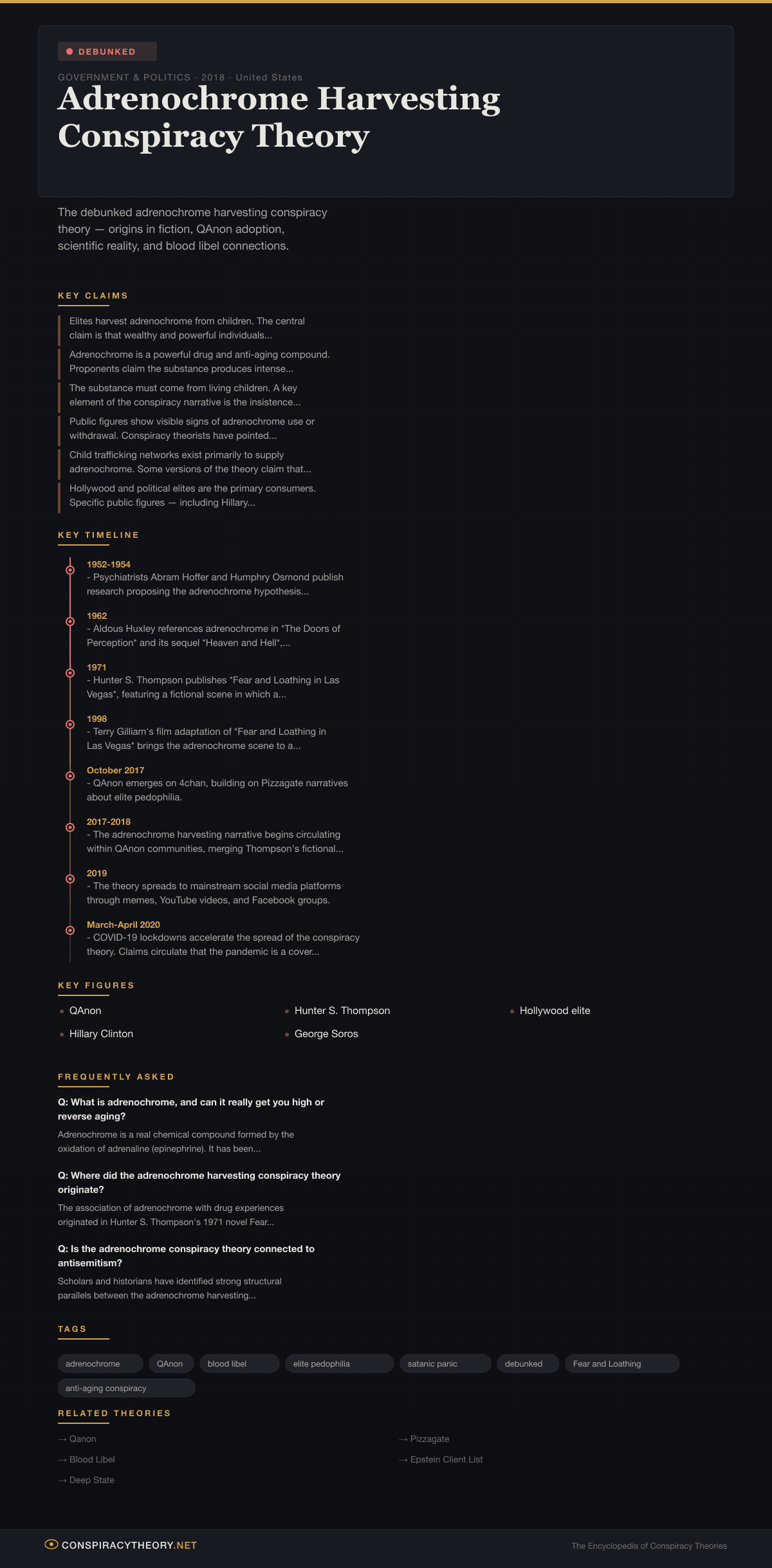 Adrenochrome Harvesting Conspiracy Theory — visual timeline and key facts infographic