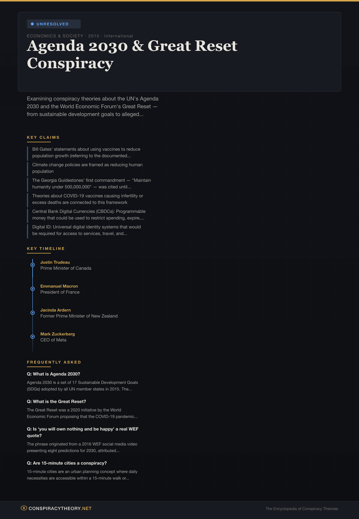 Agenda 2030 — the United Nations’ set of 17 Sustainable Development Goals (SDGs) adopted in 2015 — and the World Economic Forum’s “Great Reset” initiative launched in 2020 have become two of the most prominent targets of conspiracy theorizing in the 2020s. Together, they represent what conspiracy theorists describe as the blueprint for a “New World Order” — a system of global governance that would abolish national sovereignty, eliminate private property, implement digital surveillance of all economic activity, and reduce the global population.