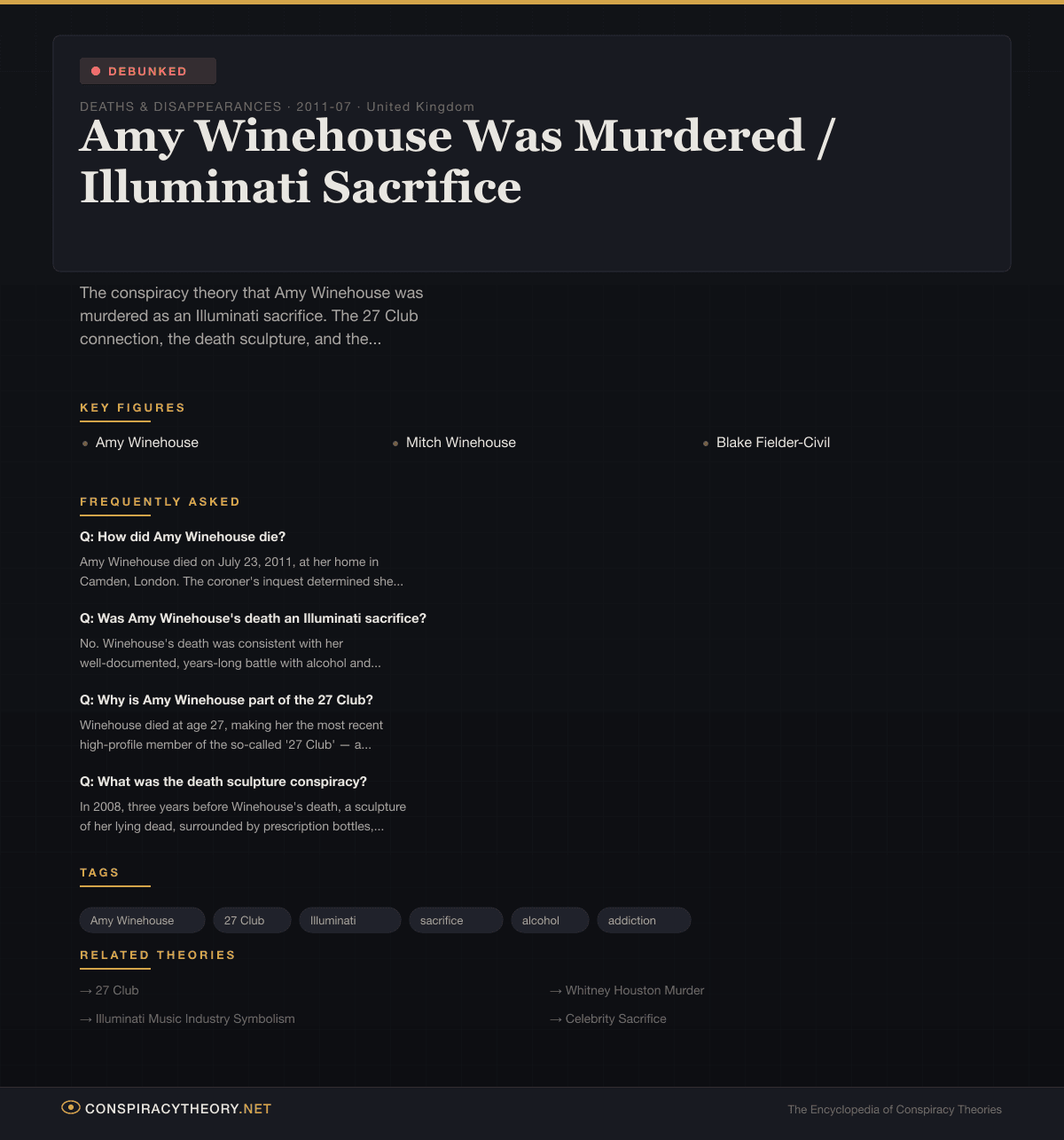 No. Winehouse's death was consistent with her well-documented, years-long battle with alcohol and drug addiction. She had been hospitalized multiple times, had publicly visible physical deterioration, and had experienced a near-fatal alcohol relapse in the weeks before her death. The Illuminati sacrifice theory is part of a broader pattern of applying conspiratorial explanations to celebrity deaths that are tragically but straightforwardly explained by addiction.