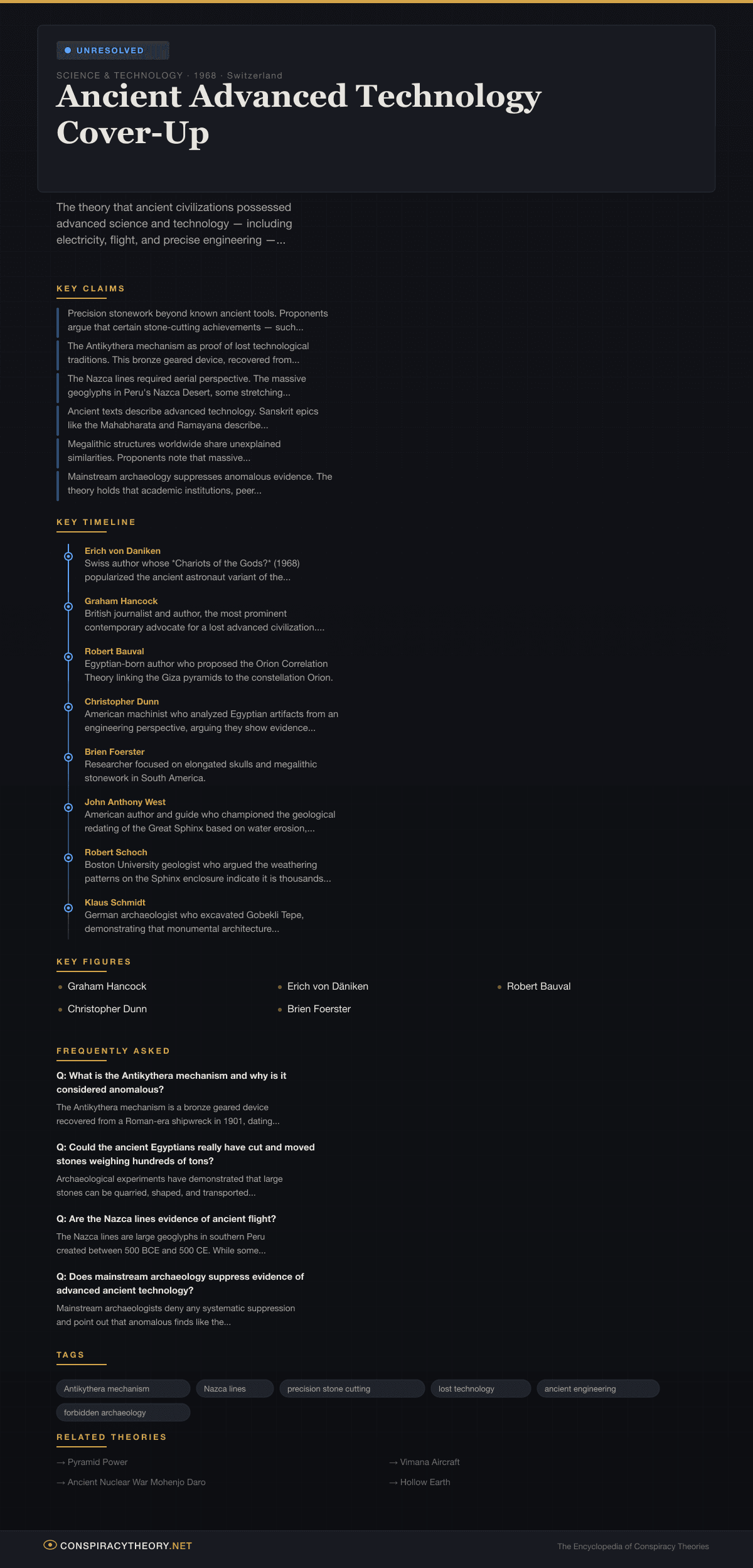 The ancient advanced technology theory proposes that civilizations of the distant past possessed scientific knowledge and engineering capabilities far beyond what mainstream archaeology attributes to them. Proponents point to artifacts, structures, and ancient texts that they argue cannot be explained by the tools and methods conventionally assigned to their eras. These include the startling mechanical complexity of the Antikythera mechanism, the enigmatic Nazca lines of Peru, the precision stonework of ancient Egypt and South America, and references to flying machines and powerful weapons in Sanskrit literature.