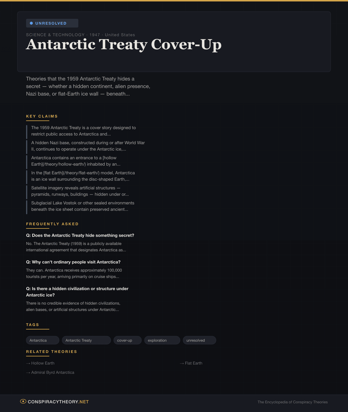 - The 1959 Antarctic Treaty is a cover story designed to restrict public access to Antarctica and conceal extraordinary secrets — whether Nazi bases, hollow Earth entrances, alien artifacts, or the edge of a flat Earth