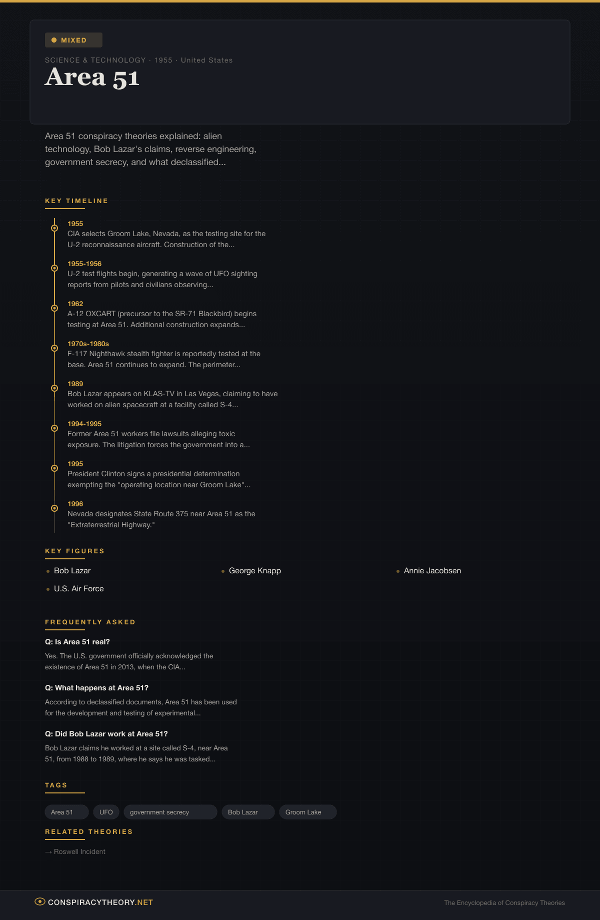 Area 51 is a highly classified United States Air Force facility located within the Nevada Test and Training Range, approximately 83 miles (134 km) northwest of Las Vegas. Officially designated as Groom Lake or Homey Airport, the installation has been at the center of conspiracy theories involving extraterrestrial technology, alien bodies, reverse-engineered spacecraft, and systematic government cover-ups since at least the late 1980s.