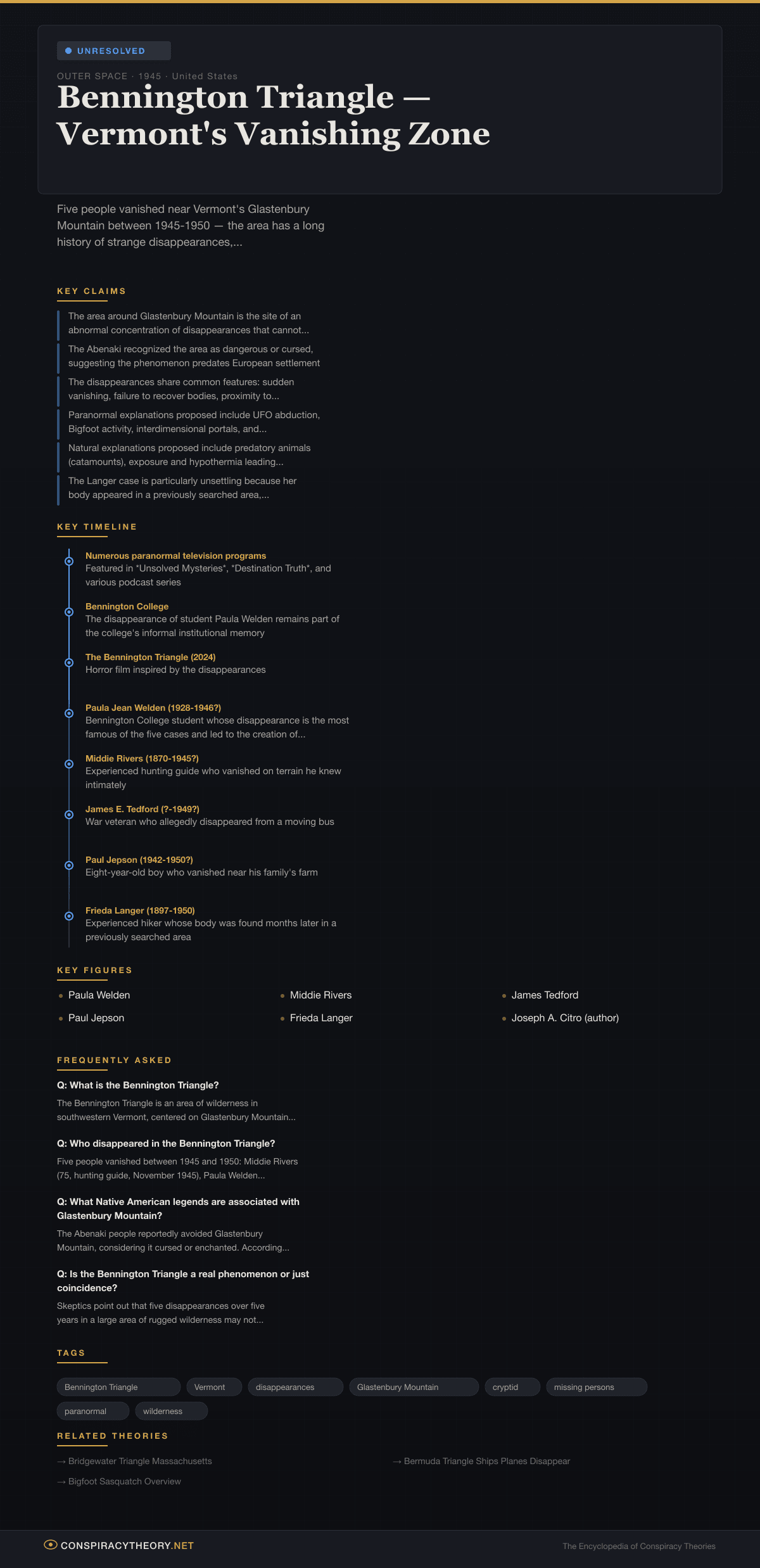 Bennington Triangle — Vermont's Vanishing Zone — Conspiracy Theory Timeline 1945, United States
