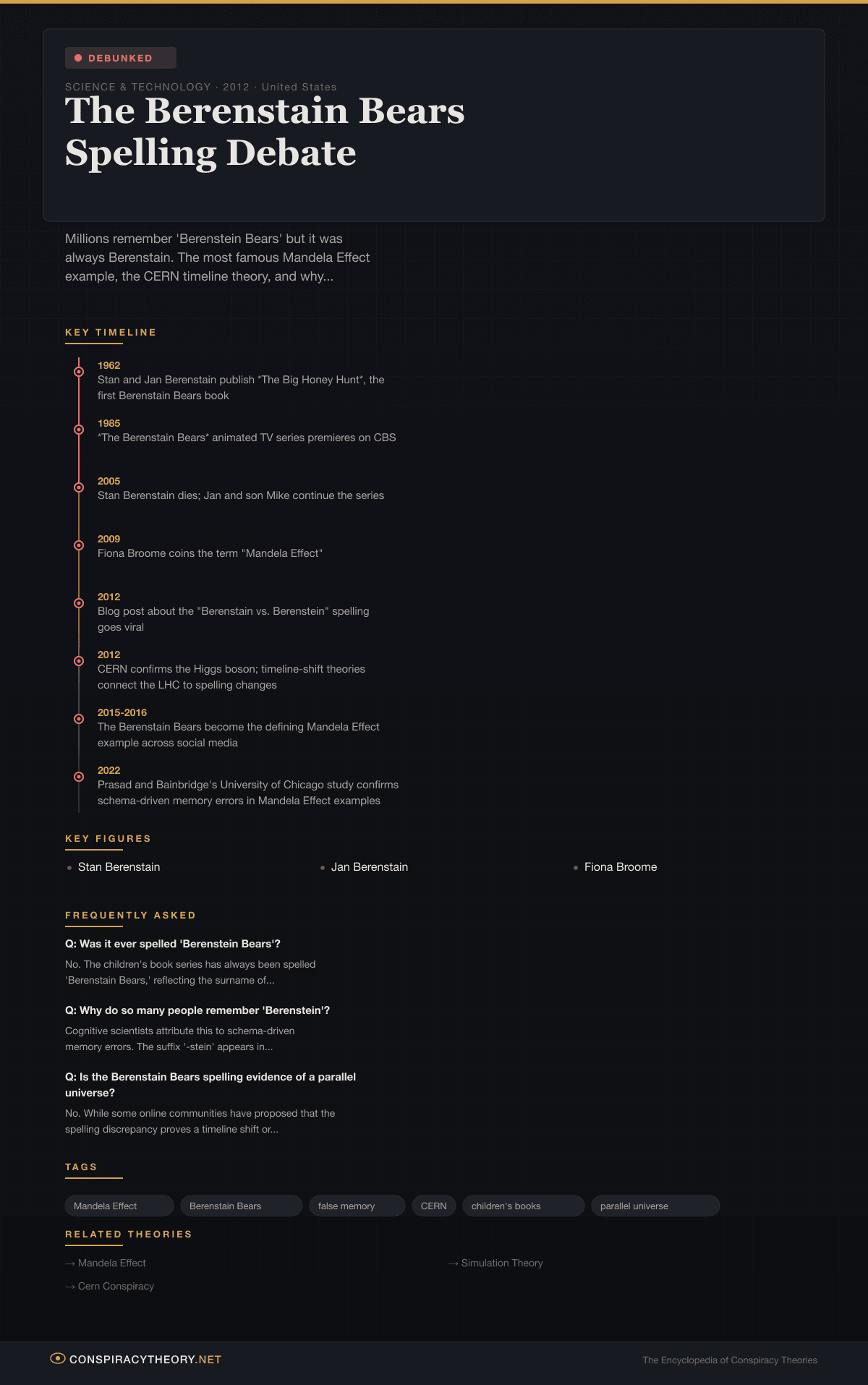 The most elaborate conspiracy explanation for the Berenstain spelling holds that CERN’s Large Hadron Collider, which began operations in 2008, inadvertently merged two parallel universes or shifted Earth’s timeline. In the “original” timeline, the theory goes, the name really was “Berenstein.” The LHC’s high-energy particle collisions disrupted spacetime, sliding everyone into a slightly different universe where minor details — including the spelling of a children’s book series — are different. Our memories of “Berenstein” are real memories from the real timeline; it’s reality that changed, not us.