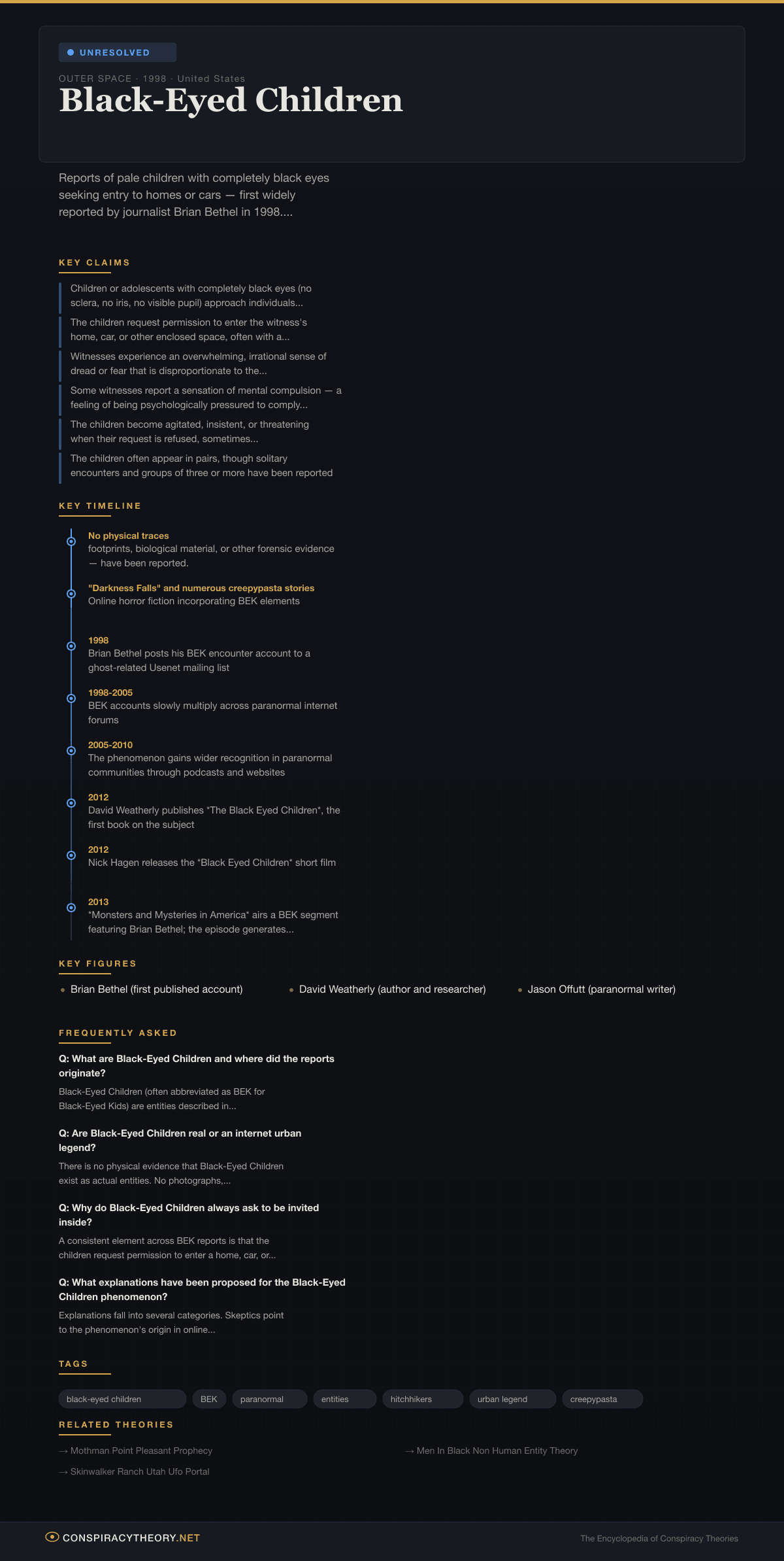 Black-Eyed Children — commonly abbreviated as BEK or BEKs — are entities described in paranormal accounts as children or adolescents, typically between the ages of six and sixteen, who appear with entirely black eyes devoid of sclera, iris, or pupil differentiation. Reports consistently describe these figures as having pale or olive-toned skin, wearing outdated or plain clothing, and exhibiting behavior that witnesses characterize as simultaneously childlike and deeply unsettling. The defining feature of virtually all BEK encounters is the entities’ insistence on being invited into the witness’s home, car, or other enclosed space, coupled with an irrational, overwhelming sense of fear experienced by the witness.