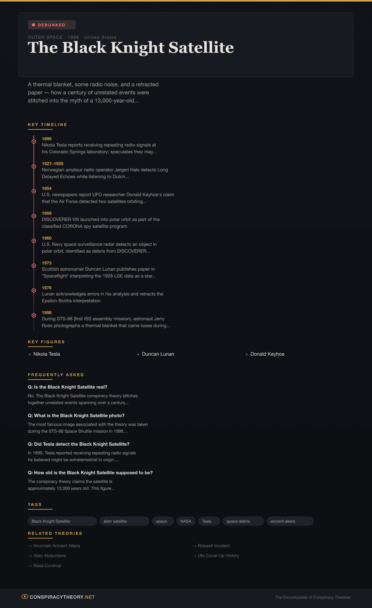 No. The Black Knight Satellite conspiracy theory stitches together unrelated events spanning over a century — Tesla's radio signals (likely from Jupiter), 1960s satellite debris, and a thermal blanket photographed during a 1998 Space Shuttle mission — into a single narrative about an ancient alien satellite. Each component has been individually identified and explained.