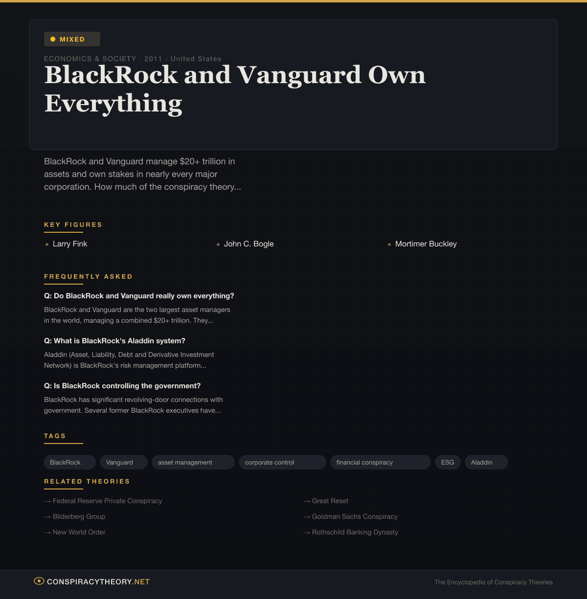 - Rothschild Banking Dynasty — older financial conspiracy framework that newer BlackRock theories sometimes incorporate, particularly claims about Vanguard’s “hidden owners”