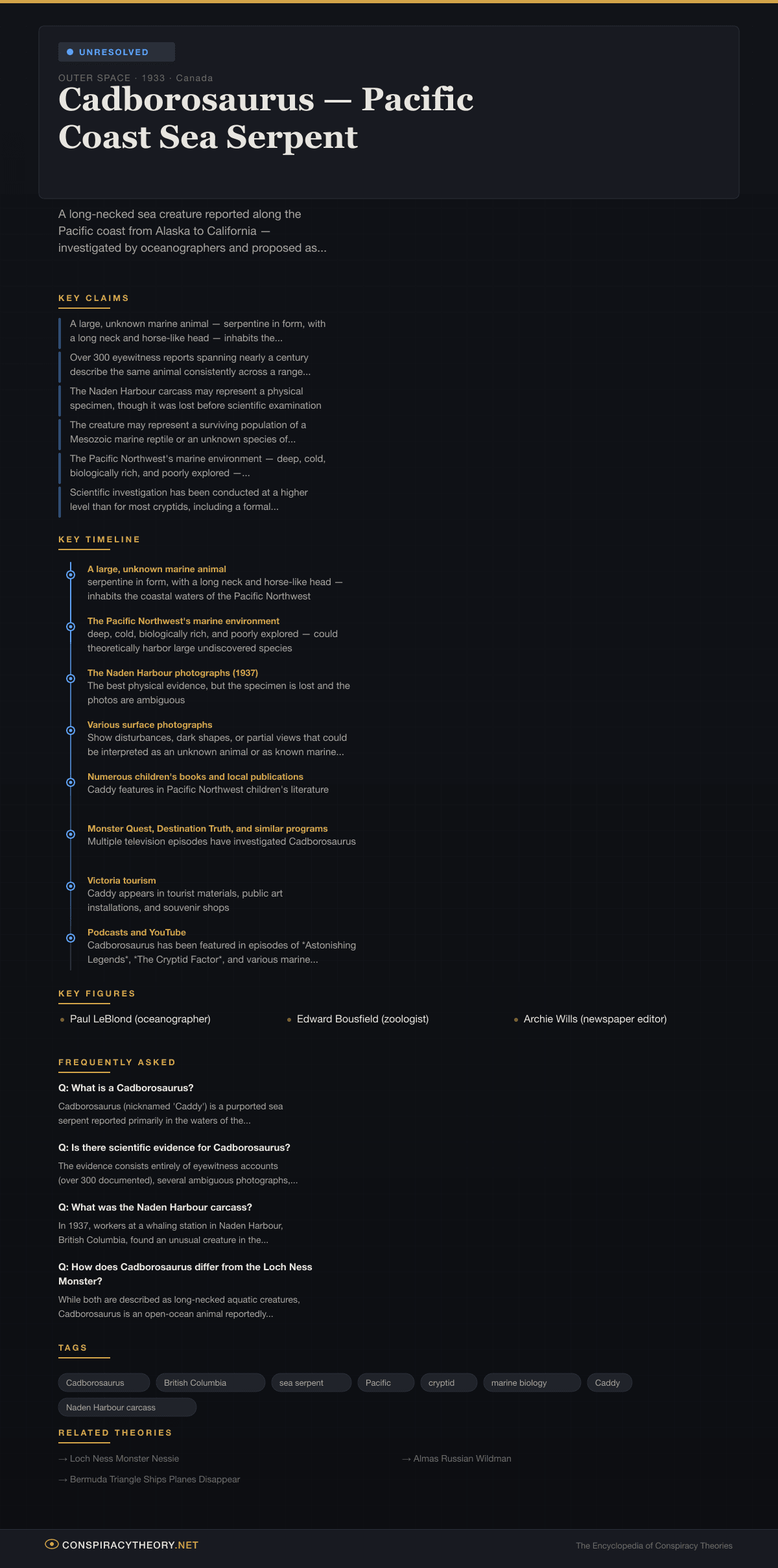Cadborosaurus — Pacific Coast Sea Serpent — Conspiracy Theory Timeline 1933, Canada
