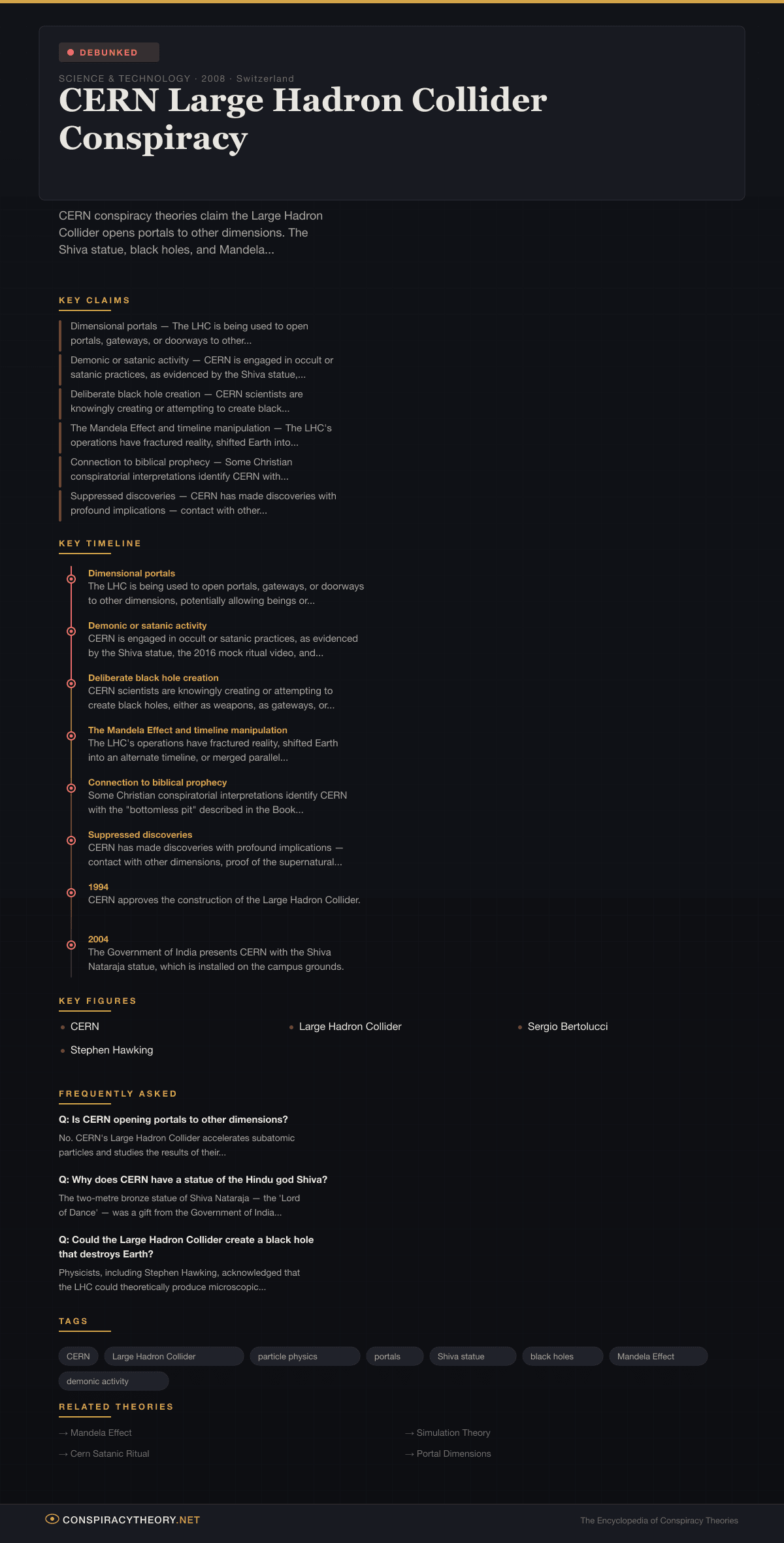 CERN Large Hadron Collider Conspiracy — visual timeline and key facts infographic