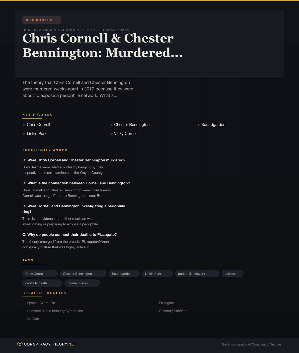 The theory connects to the broader Pizzagate/QAnon ecosystem that was at peak intensity in 2017. Believers were already convinced that powerful elites operated pedophile networks. The deaths of two famous musicians in quick succession provided new material to be woven into the narrative.