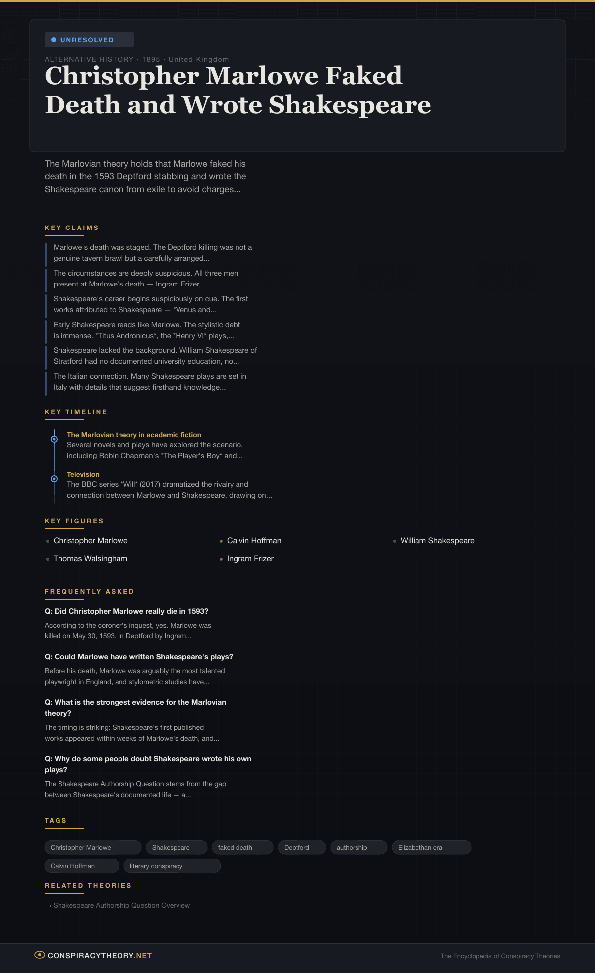 Christopher Marlowe Faked Death and Wrote Shakespeare — Conspiracy Theory Timeline 1895, United Kingdom