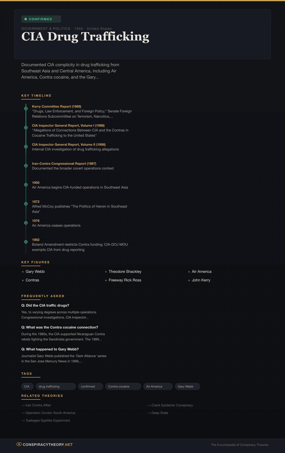 This entry is classified as confirmed based on congressional investigations (particularly the Kerry Committee report), CIA Inspector General reports, declassified documents, and federal court proceedings. The precise extent of CIA knowledge and complicity in each instance remains debated, with the CIA acknowledging tolerance of drug trafficking by its assets while generally denying direct participation in trafficking operations.
