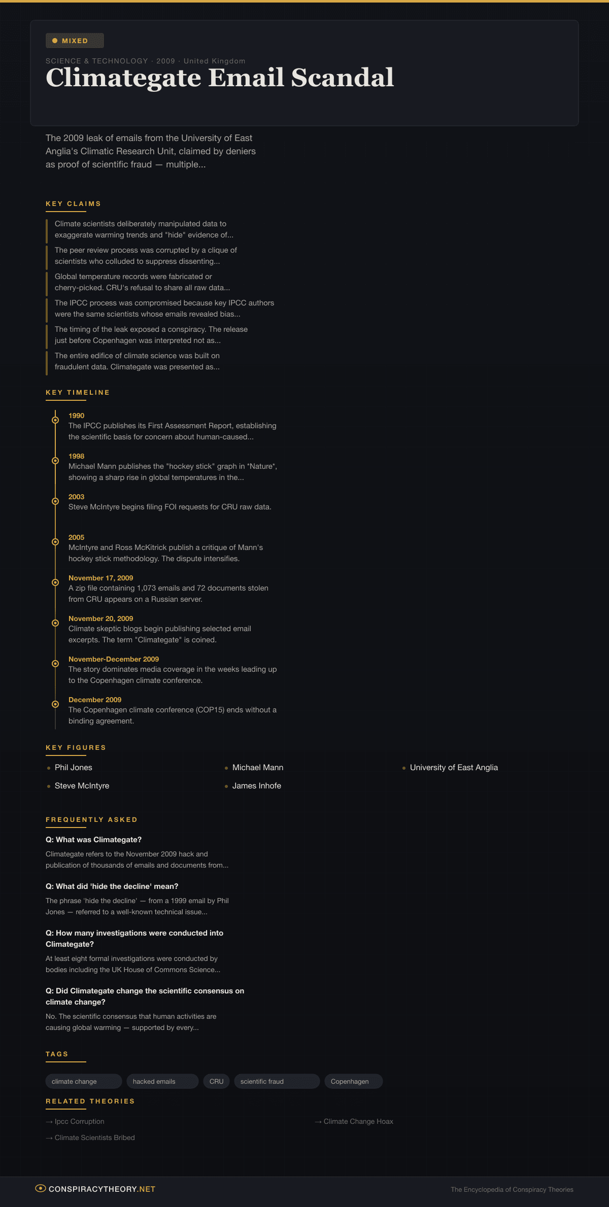 - July 2010 — The Muir Russell inquiry publishes its report, clearing CRU scientists but criticizing data-sharing practices.