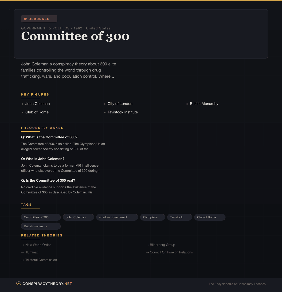 No credible evidence supports the existence of the Committee of 300 as described by Coleman. His book provides no verifiable sources, no documents, no whistleblower testimony beyond his own, and no mechanism by which such a committee would function. The theory is essentially a compilation of various real and imagined elite organizations woven into a single omnipotent body. While some of the organizations Coleman references are real (Club of Rome, Tavistock Institute), his claims about their activities and coordination are unsupported.