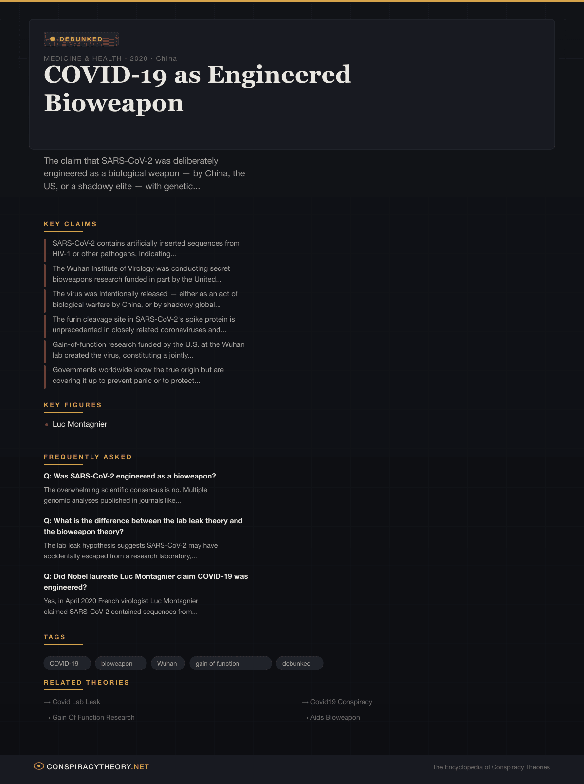 Within weeks of the first reports of a novel coronavirus spreading through Wuhan, China, in January 2020, a claim emerged that would become one of the most consequential conspiracy theories of the pandemic era: SARS-CoV-2, the virus that causes COVID-19, was not a naturally occurring pathogen that had jumped from animals to humans. It was a biological weapon — deliberately engineered in a laboratory and either intentionally released or deployed as an act of war.