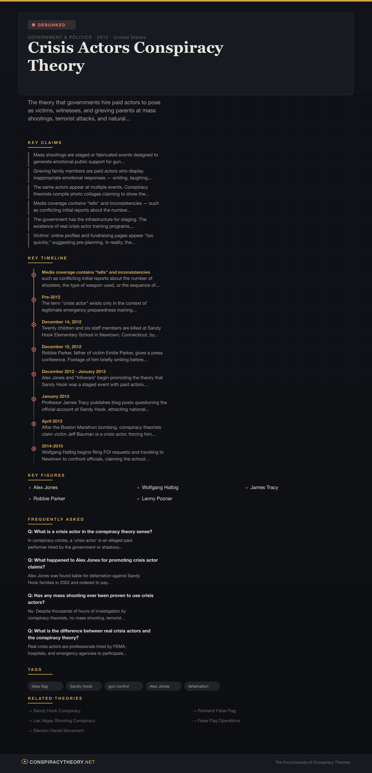 Crisis Actors Conspiracy Theory — visual timeline and key facts infographic