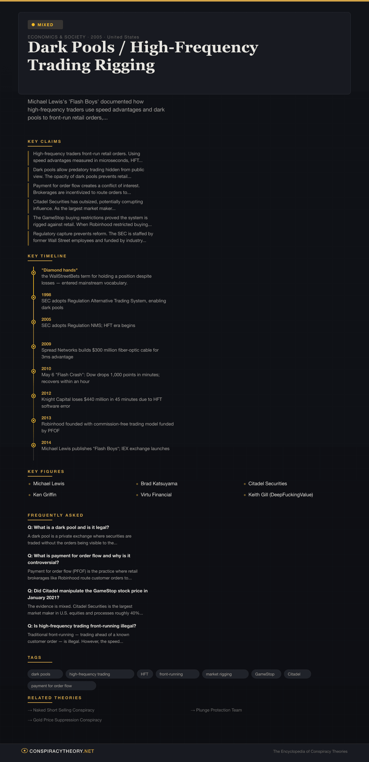 The documented problems with market structure — PFOF conflicts, dark pool opacity, HFT speed advantages — are real and significant. Where the conspiracy narrative overreaches is in attributing these structural features to a coordinated conspiracy among identifiable actors.