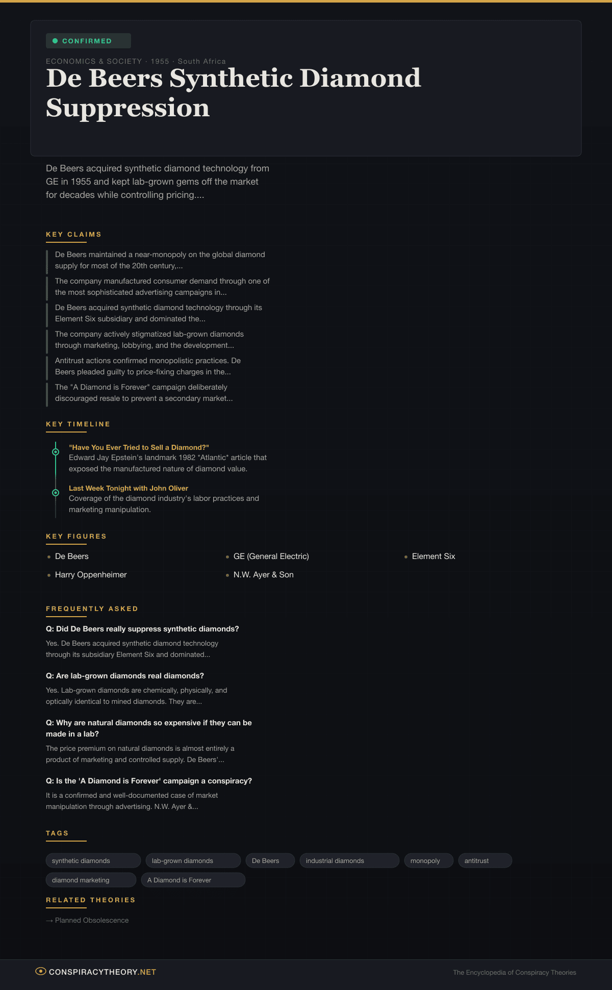 De Beers Synthetic Diamond Suppression — Conspiracy Theory Timeline 1955, South Africa