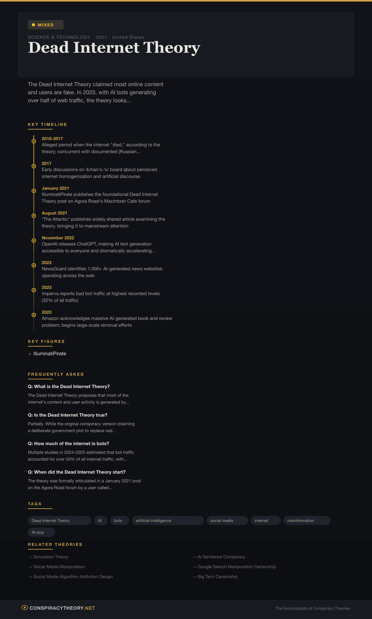 The Dead Internet Theory was formally articulated in a post published on the Agora Road’s Macintosh Cafe forum in January 2021 by a user called “IlluminatiPirate.” The post, titled “Dead Internet Theory: Most of the Internet is Fake,” argued that the internet had been effectively “dead” since 2016 or 2017, with most content and interactions replaced by AI-generated material orchestrated by government agencies and corporations.
