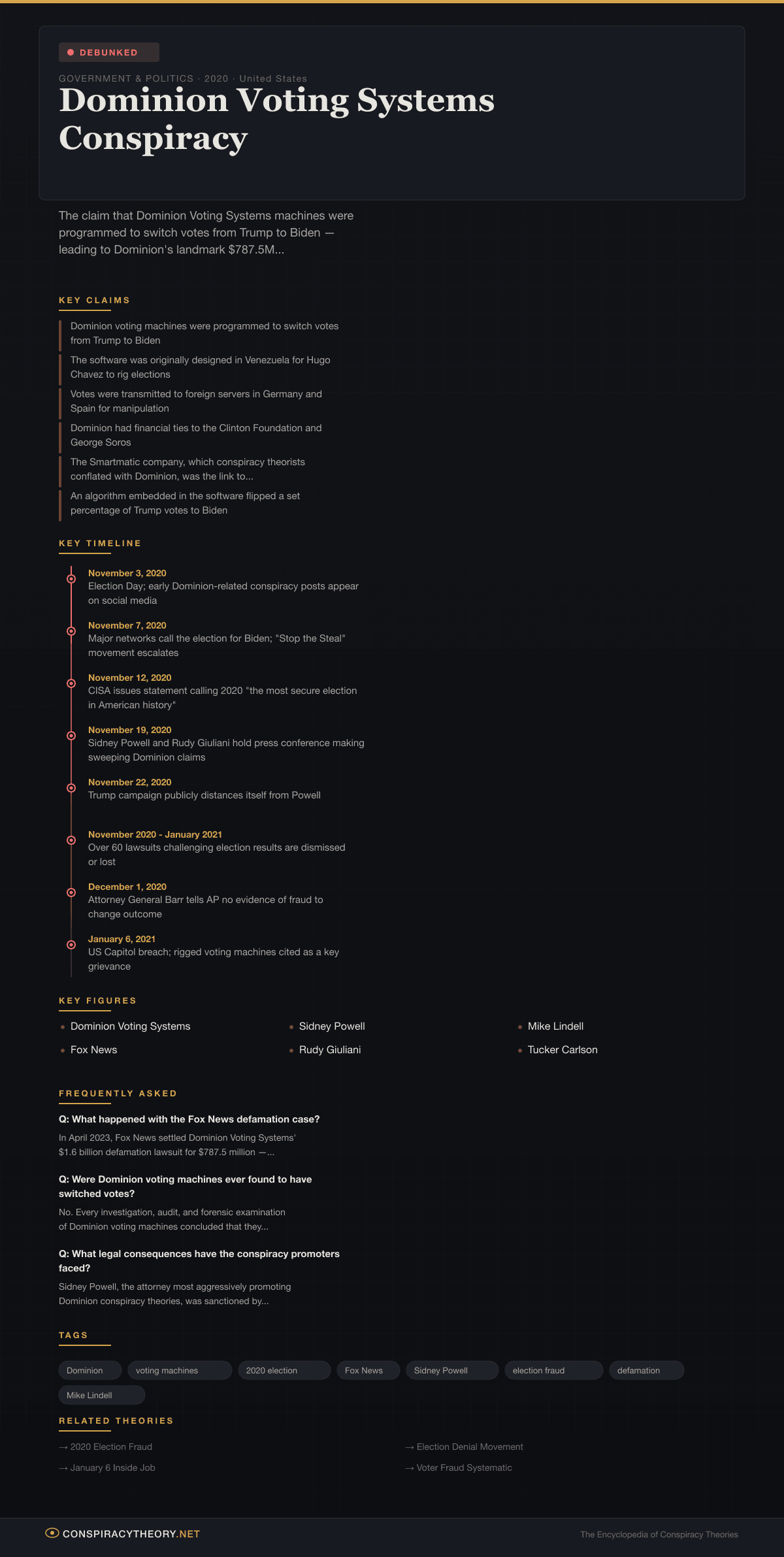 Dominion Voting Systems Conspiracy — visual timeline and key facts infographic