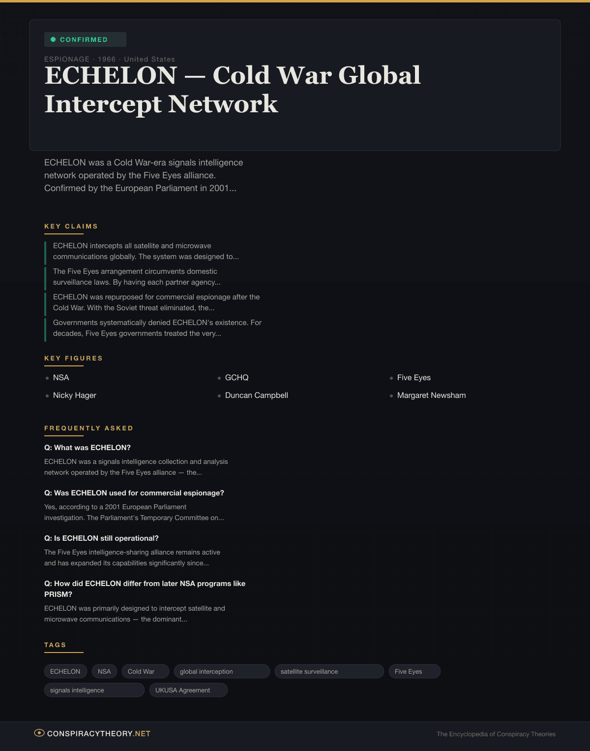 ECHELON — Cold War Global Intercept Network — visual timeline and key facts infographic