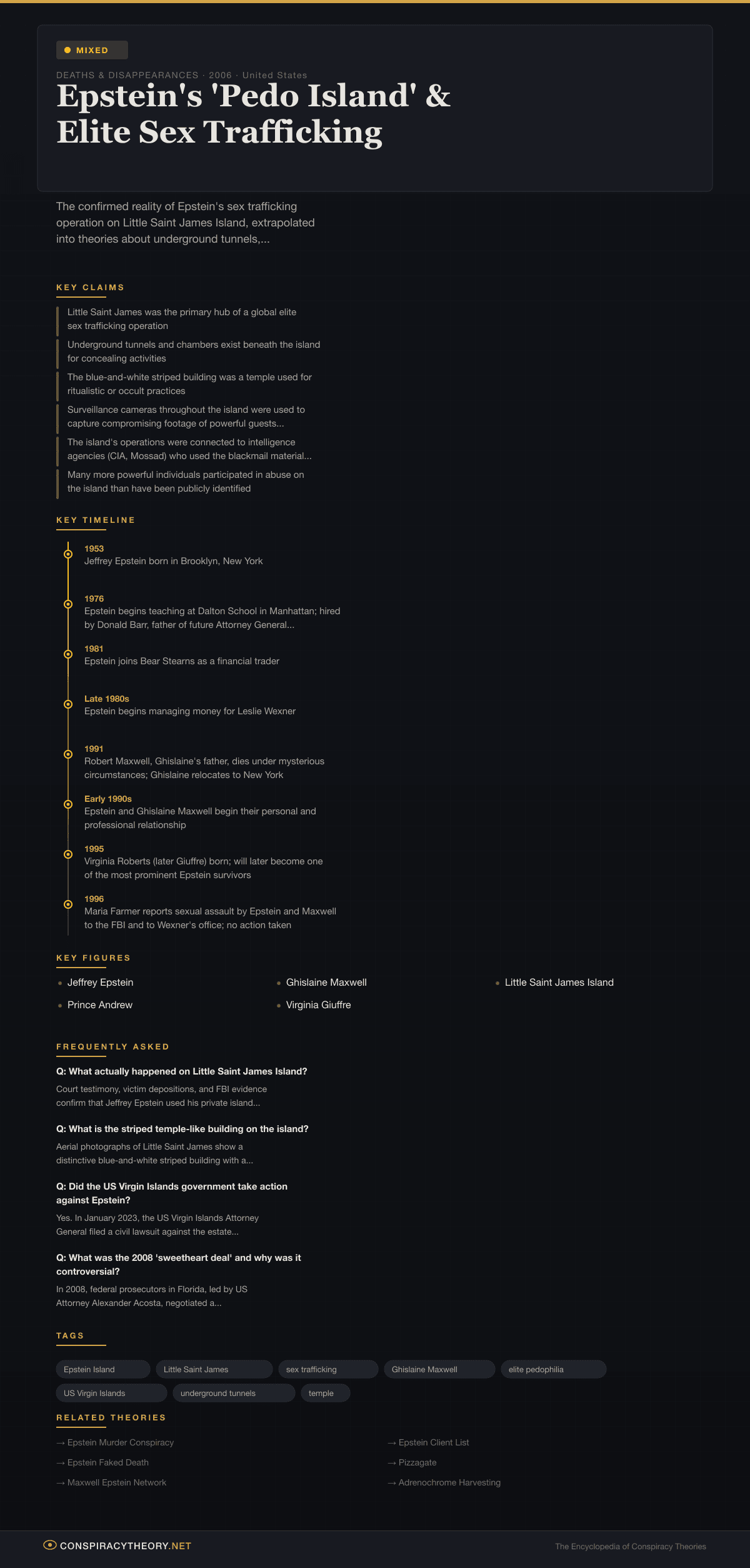 This theory is classified as “mixed” because the core claim — that Epstein used his private island for sex trafficking involving powerful individuals — is confirmed by criminal convictions and extensive evidence. However, many of the more elaborate claims about underground facilities, ritualistic practices, the full scale of elite involvement, and the operation’s connections to intelligence agencies remain speculative and unverified.