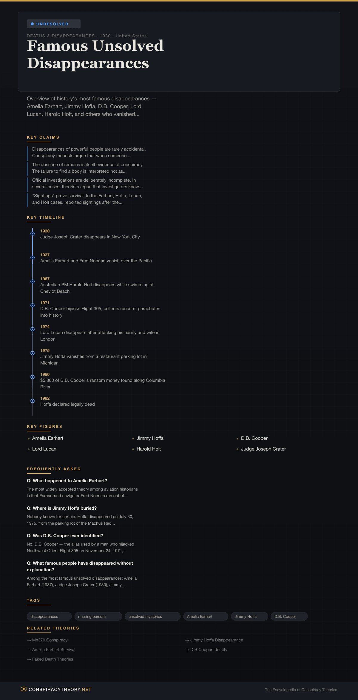 Among the most famous unsolved disappearances: Amelia Earhart (1937), Judge Joseph Crater (1930), Jimmy Hoffa (1975), Lord Lucan (1974), Australian PM Harold Holt (1967), labor organizer Jimmy Hoffa (1975), and in more recent history, Malaysia Airlines Flight 370 with 239 passengers (2014). Each case has generated extensive conspiracy theories due to the absence of definitive evidence about what happened.