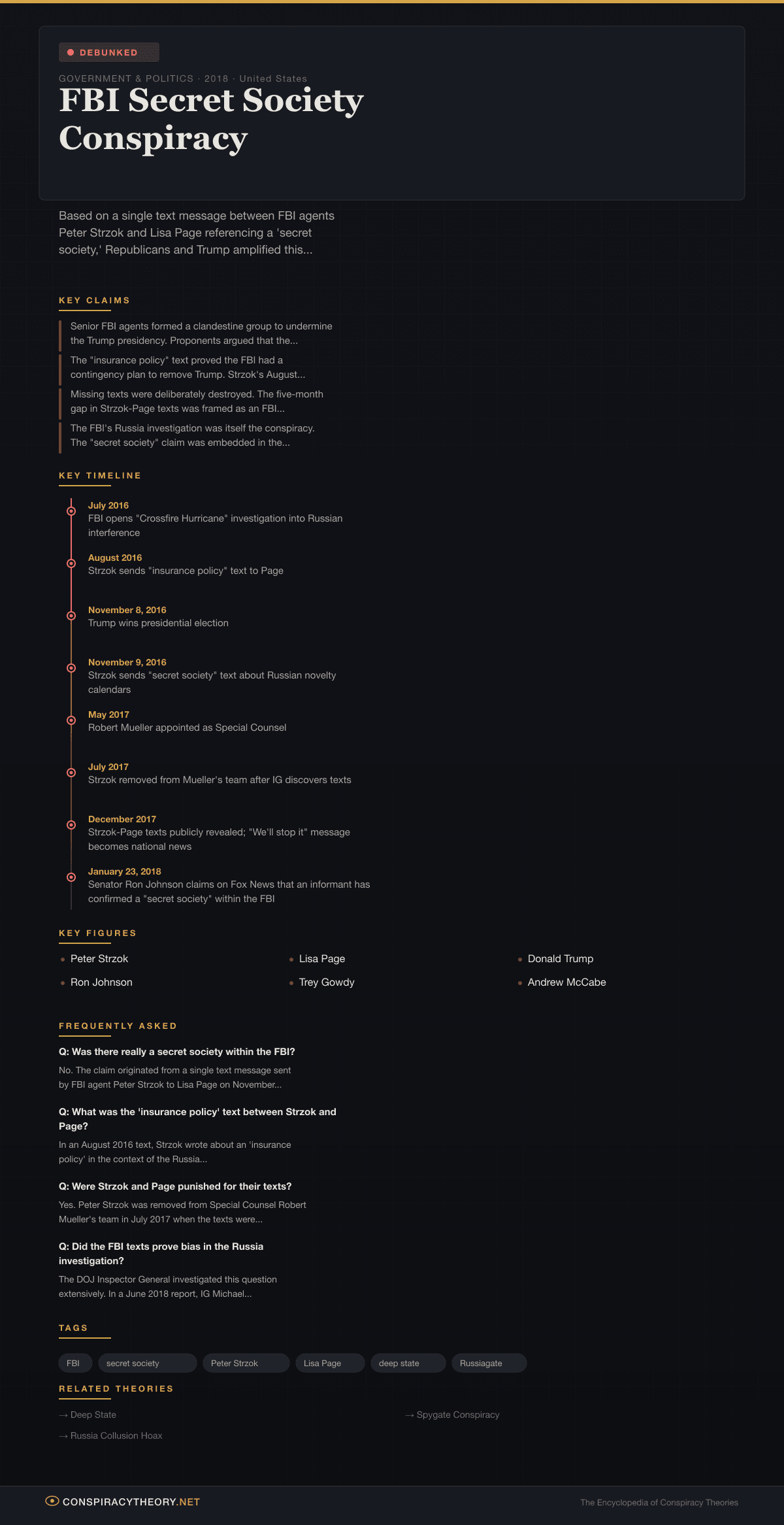 The FBI’s Russia investigation was itself the conspiracy. The “secret society” claim was embedded in the broader theory — variously called Spygate or the “Russia hoax” — that the FBI, CIA, and Obama administration conspired to fabricate Russian collusion allegations against Trump.