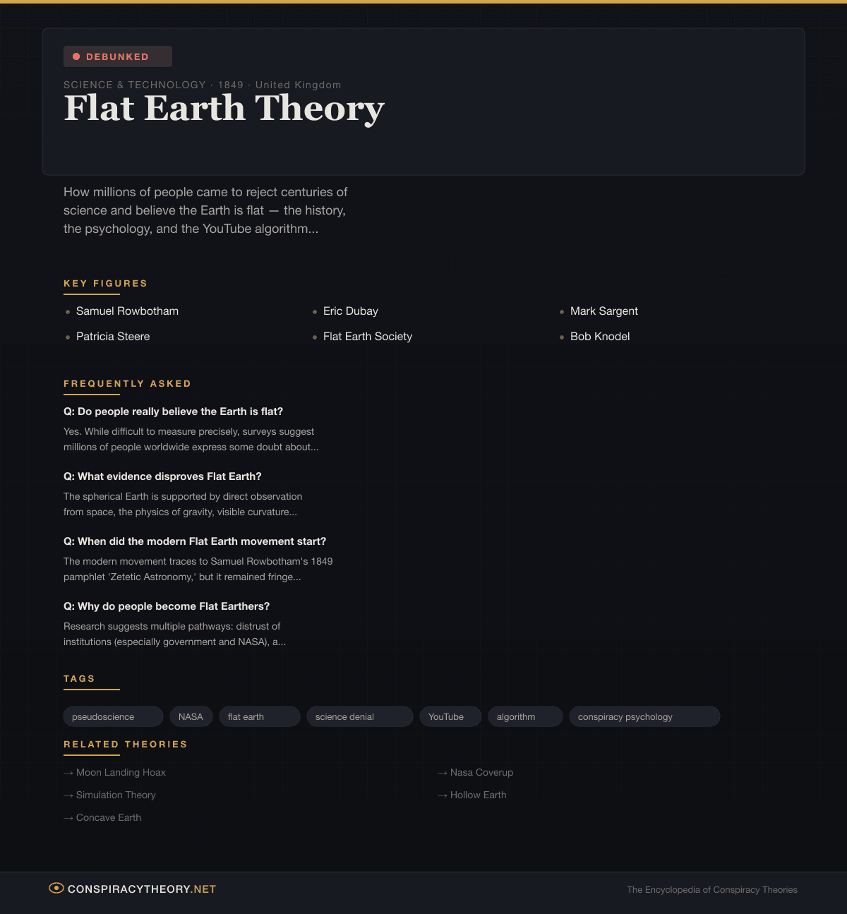 - Moon Landing Hoax — NASA deception theory frequently co-held with Flat Earth