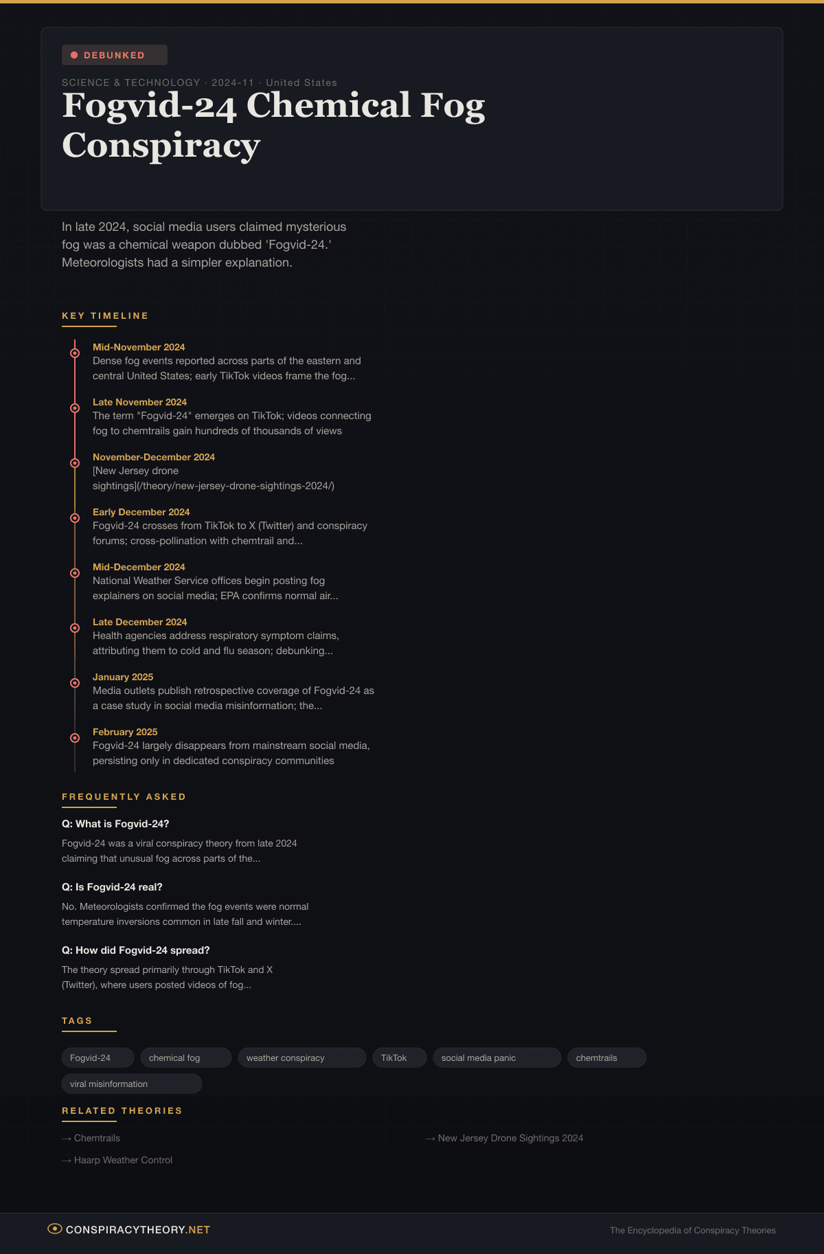 • January 2025 — Media outlets publish retrospective coverage of Fogvid-24 as a case study in social media misinformation; the theory fades from trending topics as fog season begins to wane