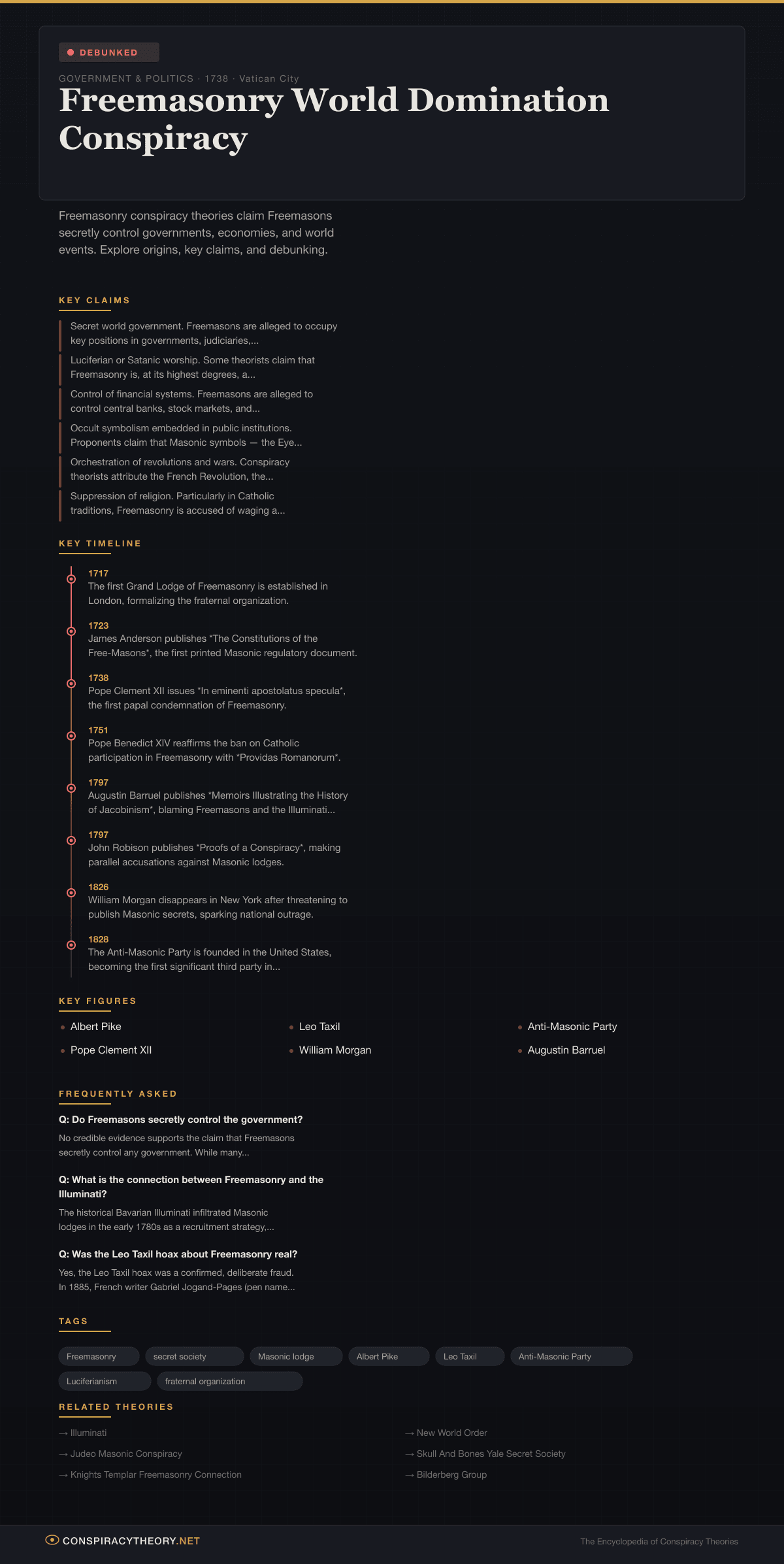 The conspiracy theories surrounding Freemasonry have been shaped by several key episodes: the Catholic Church’s sustained opposition beginning with Pope Clement XII’s 1738 papal bull In eminenti apostolatus specula; the Morgan affair of 1826 in the United States, which gave rise to the Anti-Masonic Party; the fraudulent writings of Leo Taxil in the 1880s and 1890s; and the persistent conflation of Freemasonry with the Bavarian Illuminati. These theories are classified as debunked because the central claims — secret world domination, Luciferian worship, and coordinated control of governments — are contradicted by extensive historical, organizational, and scholarly evidence, and because several foundational anti-Masonic texts have been proven to be deliberate fabrications.