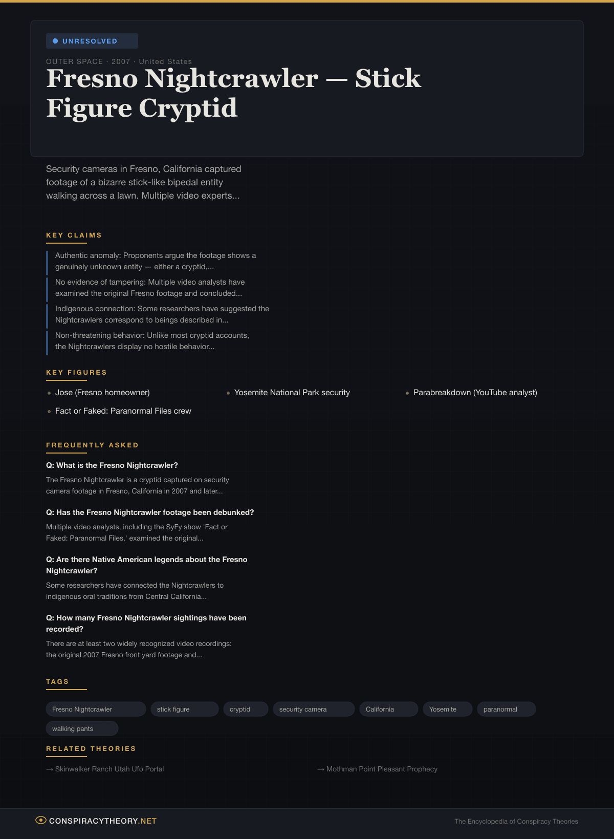 Fresno Nightcrawler — Stick Figure Cryptid — visual timeline and key facts infographic