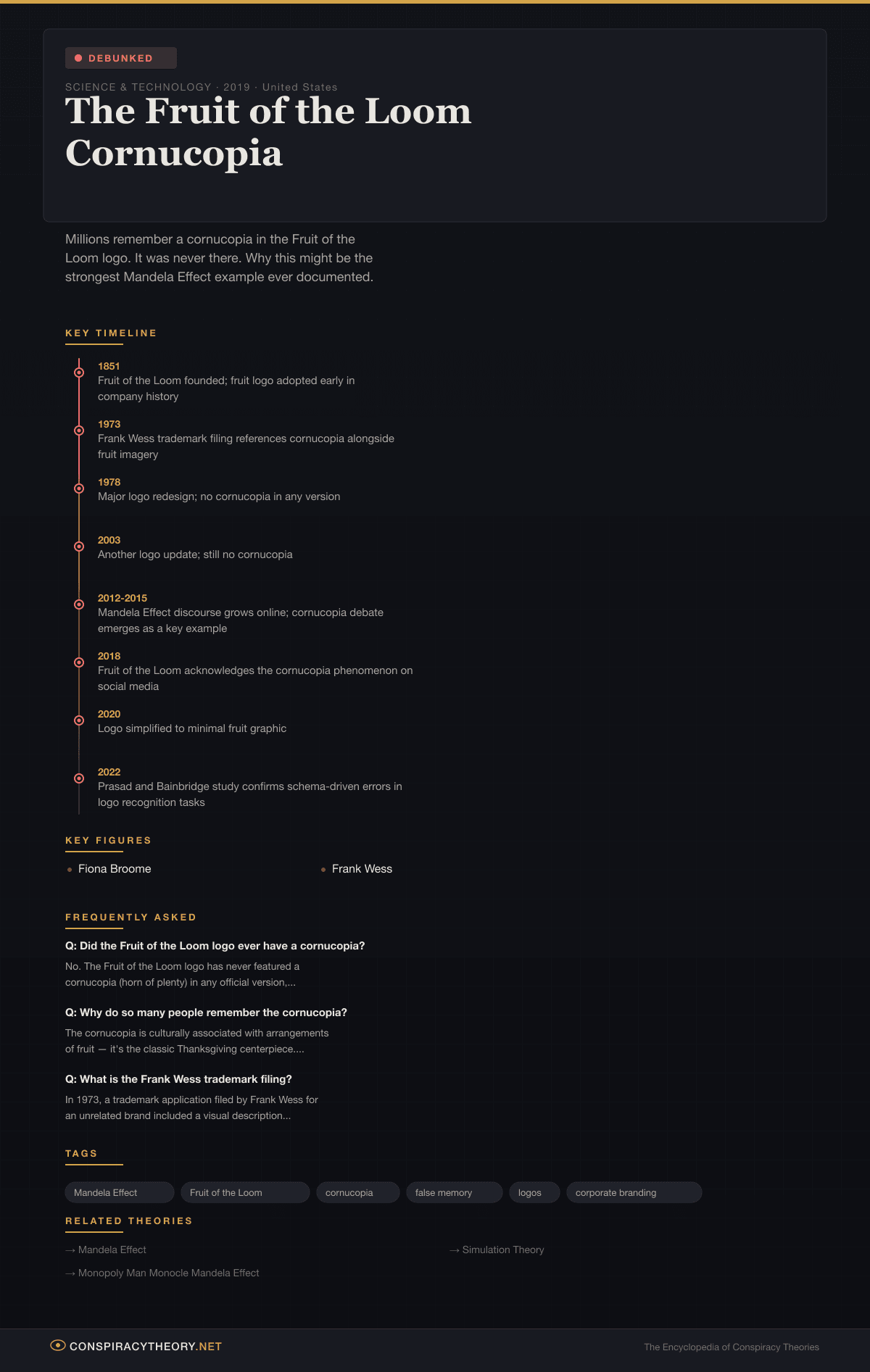 The most intriguing piece of circumstantial evidence in the cornucopia debate comes from a 1973 trademark application. Filed by a designer named Frank Wess, the application included a visual description that mentioned “a cornucopia” alongside fruit imagery. This filing was not for Fruit of the Loom — it appears to have been for an unrelated brand concept — but its existence has been seized upon by Mandela Effect researchers as a potential “residue” from the original timeline.
