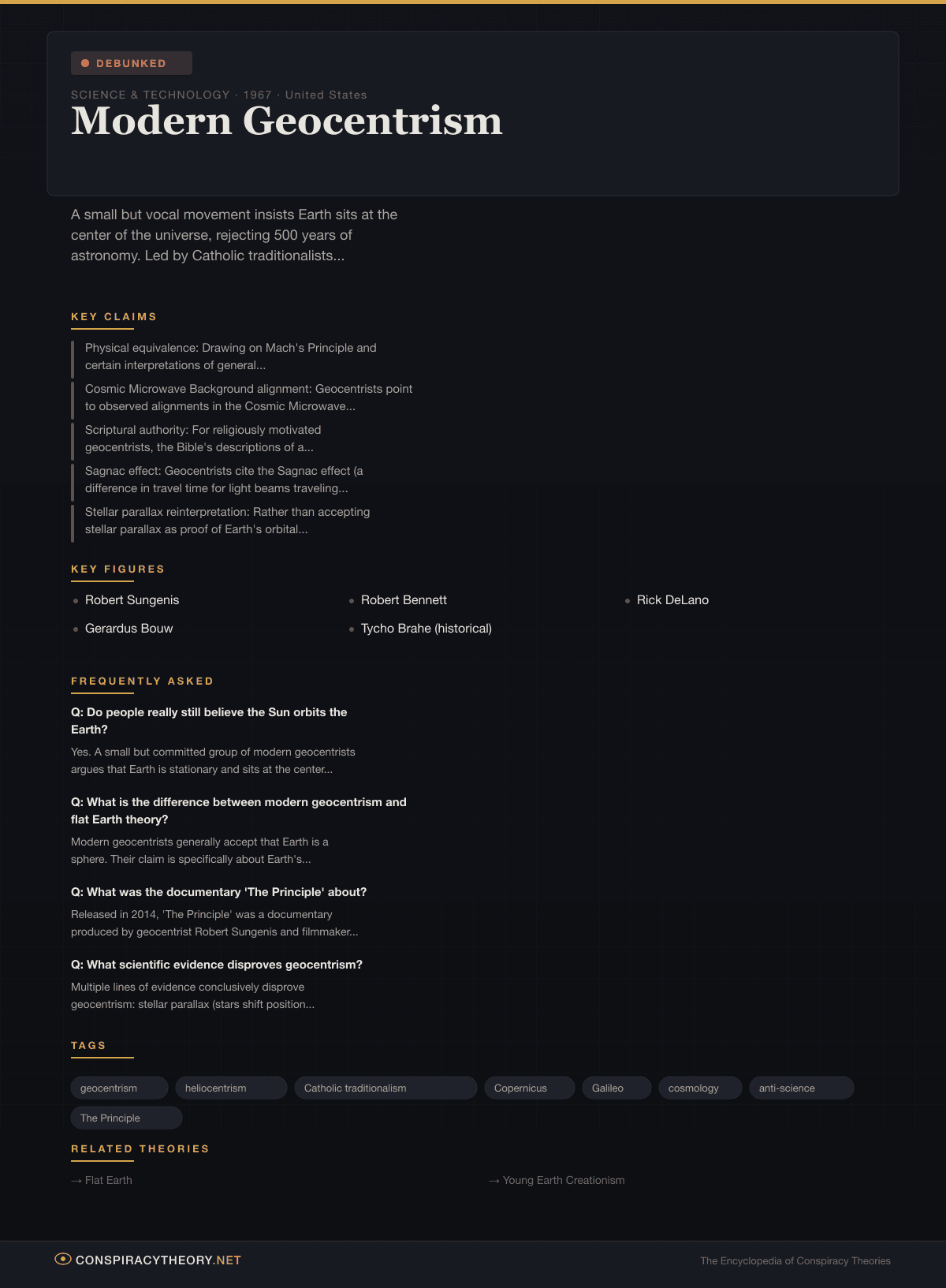 Modern geocentrism functions as a fascinating case study in the intersection of religious conviction and scientific denial. Unlike Flat Earth theory, which has become a mass internet phenomenon, geocentrism remains a niche movement — but it’s a niche that reveals important dynamics about how fringe beliefs are constructed and maintained.