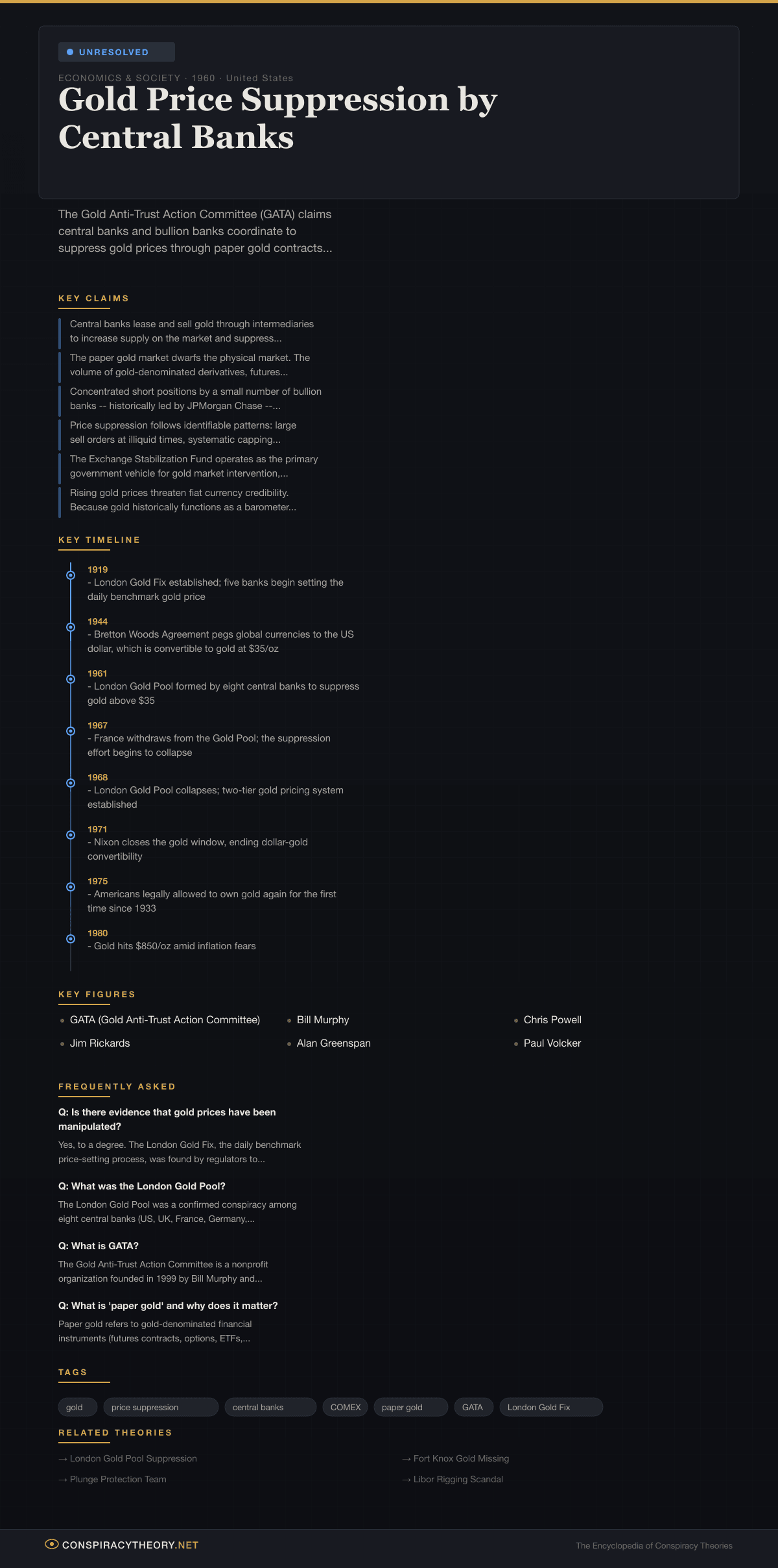 The gold price suppression theory occupies a unique space in conspiracy culture because it sits at the intersection of financial markets, monetary policy, and geopolitics — and because elements of it have been repeatedly validated.