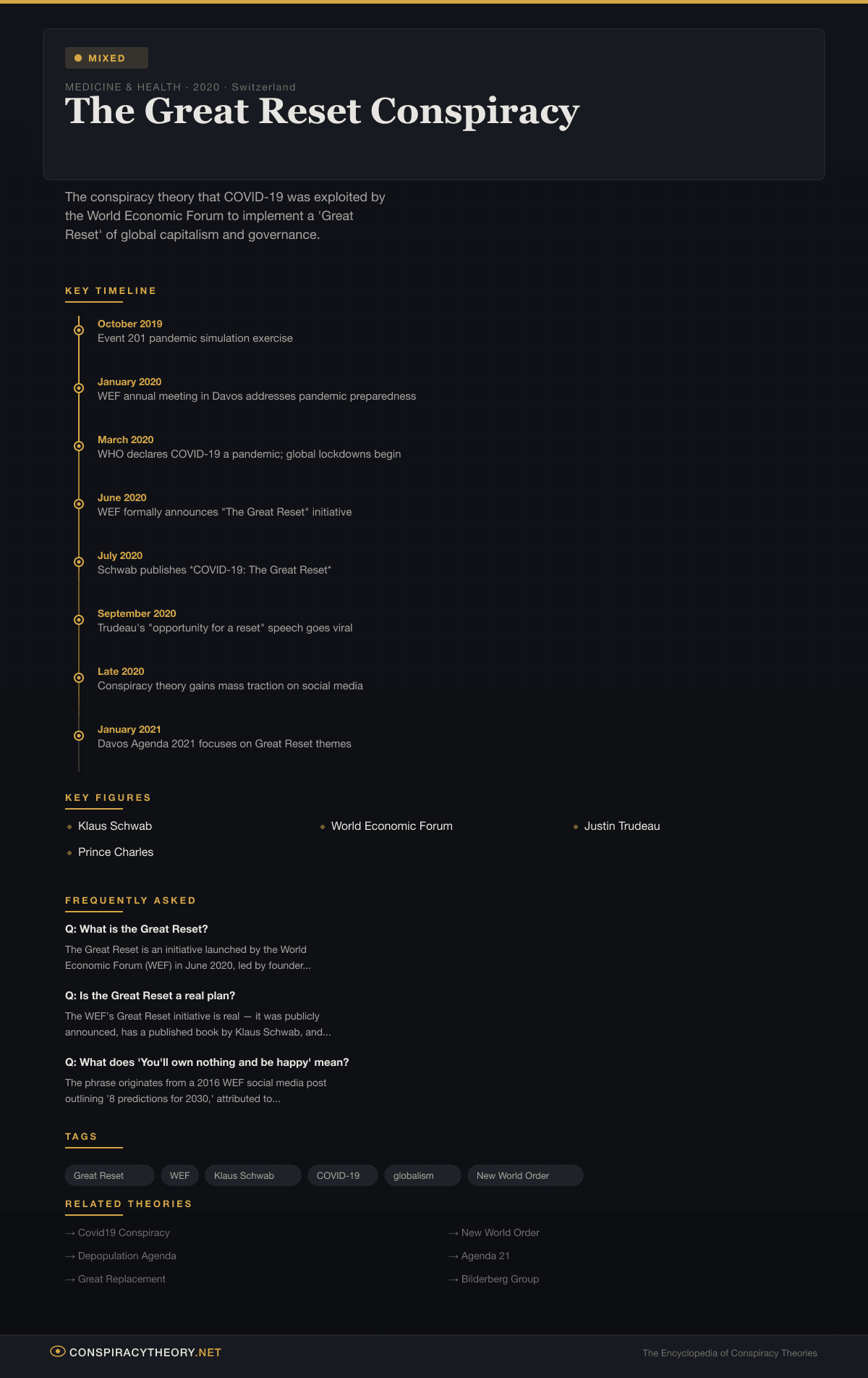 The theory is classified as mixed because the underlying initiative is real and the WEF’s agenda does propose significant economic restructuring, but the conspiratorial interpretation — that COVID-19 was created or exploited as part of a deliberate plan for authoritarian world government — lacks evidence and attributes capabilities to the WEF that the organization does not possess.