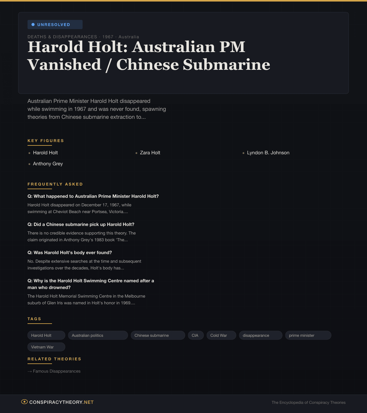 On December 17, 1967, the 17th Prime Minister of Australia walked into the surf at Cheviot Beach, a rugged stretch of Victorian coastline known for its dangerous currents, and never came back. Harold Holt’s disappearance while swimming — during his time as the sitting head of government of a Western nation — remains one of the most bizarre episodes in political history and one of the Cold War’s most durable mysteries.