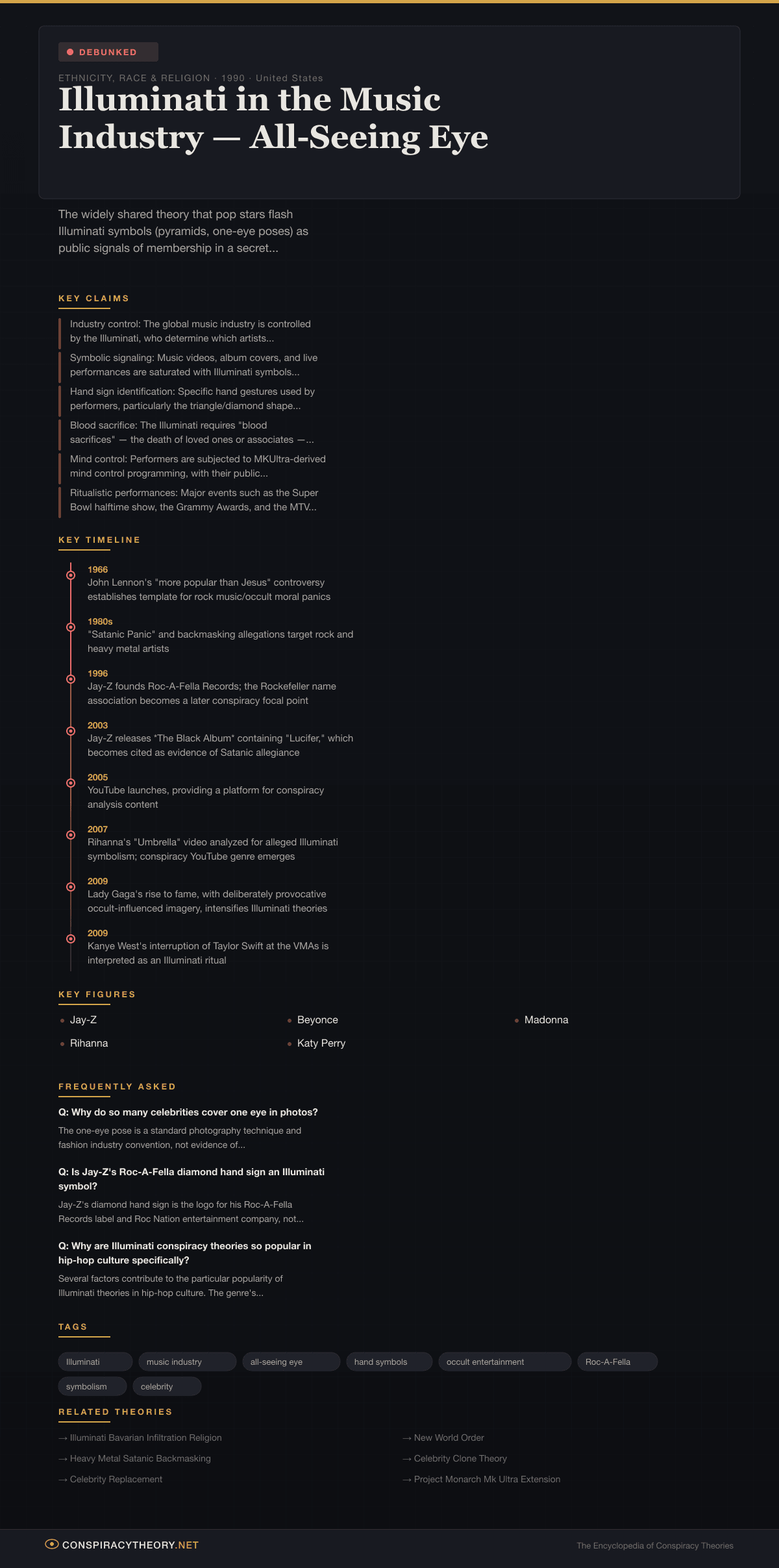 The theory that the global music industry is controlled by the Illuminati — a secret society that uses pop stars as vehicles for occult symbolism and social manipulation — is one of the most widely circulated conspiracy theories in contemporary popular culture. According to this theory, major recording artists including Jay-Z, Beyonce, Rihanna, Madonna, Katy Perry, Lady Gaga, and many others are either members of the Illuminati or puppets controlled by the organization, and their music, performances, and public appearances are saturated with hidden symbols — pyramids, the All-Seeing Eye, inverted crosses, pentagrams, and specific hand gestures — that serve as public declarations of Illuminati allegiance and vehicles for mass mind control.