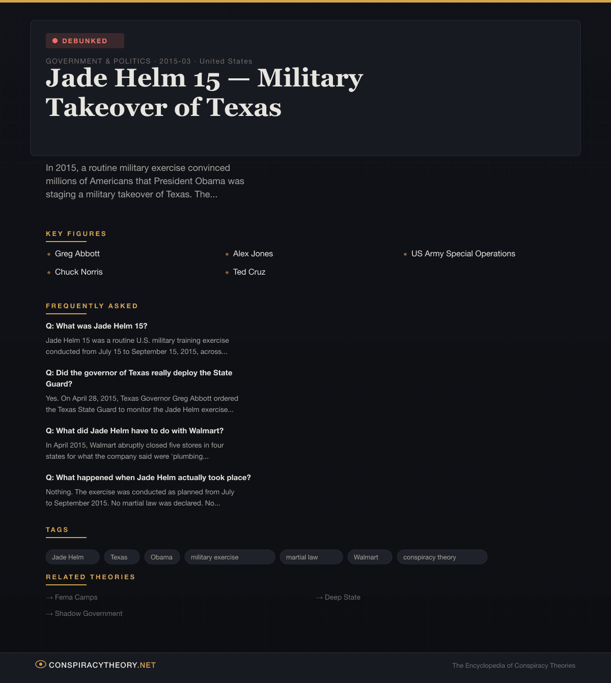 Jade Helm 15 is one of the purest case studies in modern conspiracy theory dynamics: how a completely ordinary event was transformed into a national panic through the intersection of political paranoia, social media amplification, and elected officials too cowardly to tell their constituents that no, the president was not invading Texas.