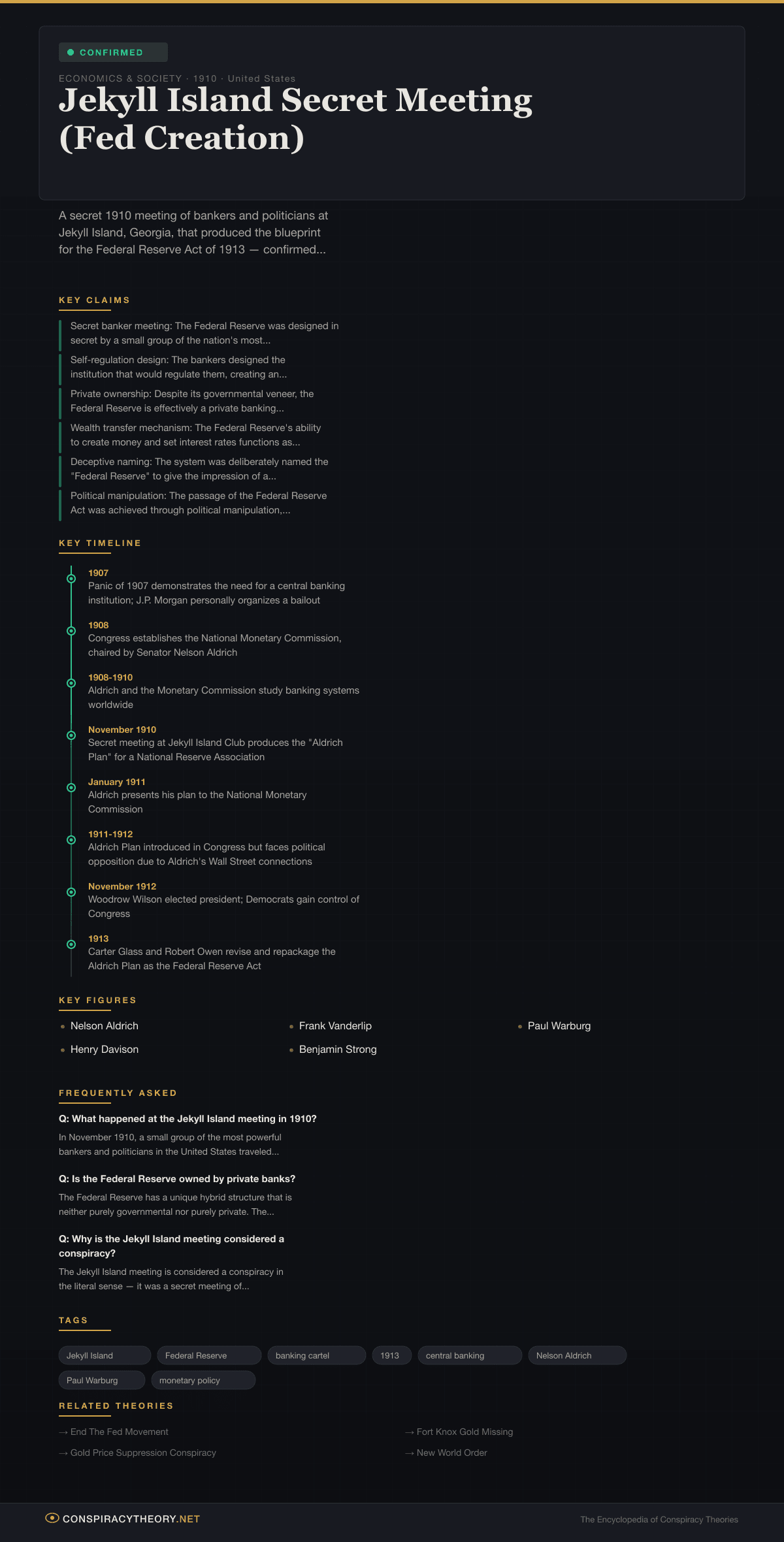 Jekyll Island Secret Meeting (Fed Creation) — visual timeline and key facts infographic