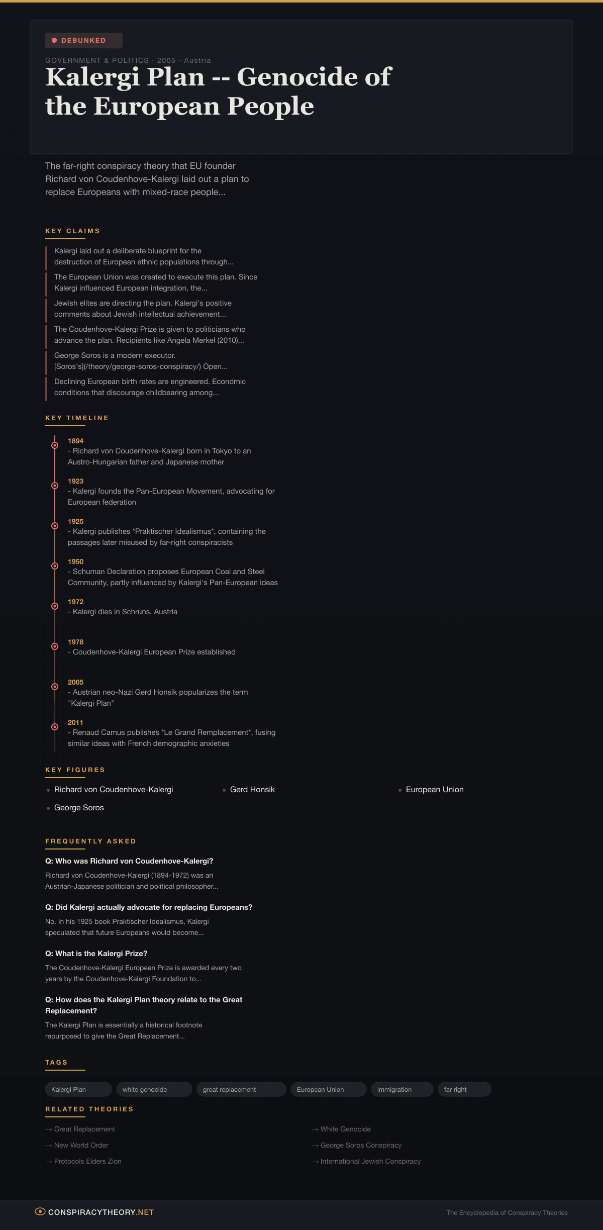Scholars of conspiracy theories note that the Kalergi Plan exemplifies how historical texts can be strip-mined for quotations that, removed from context, appear to support pre-existing beliefs. Kalergi’s actual legacy — as a pioneer of European peace and integration — is essentially unrelated to the conspiracy theory that bears his name.