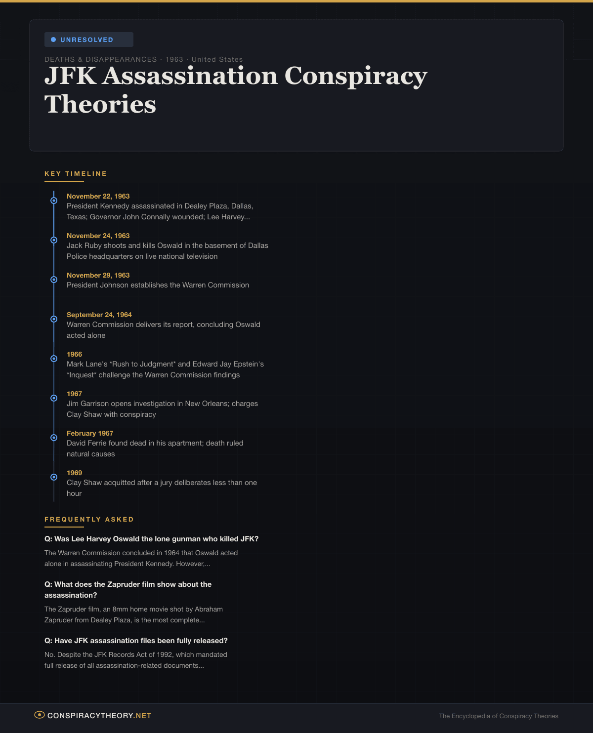 The gap between these two official conclusions — combined with the murder of Oswald himself by nightclub owner Jack Ruby on live television two days after the assassination, the documented failures of the Secret Service, the CIA’s concealment of relevant information from the Warren Commission, and the continued withholding of classified documents — has sustained conspiracy theories across political, generational, and ideological lines. The JFK assassination is not one conspiracy theory but a constellation of competing theories, each proposing different perpetrators, motives, and mechanisms while sharing the common premise that the official lone-gunman conclusion is incomplete or false.