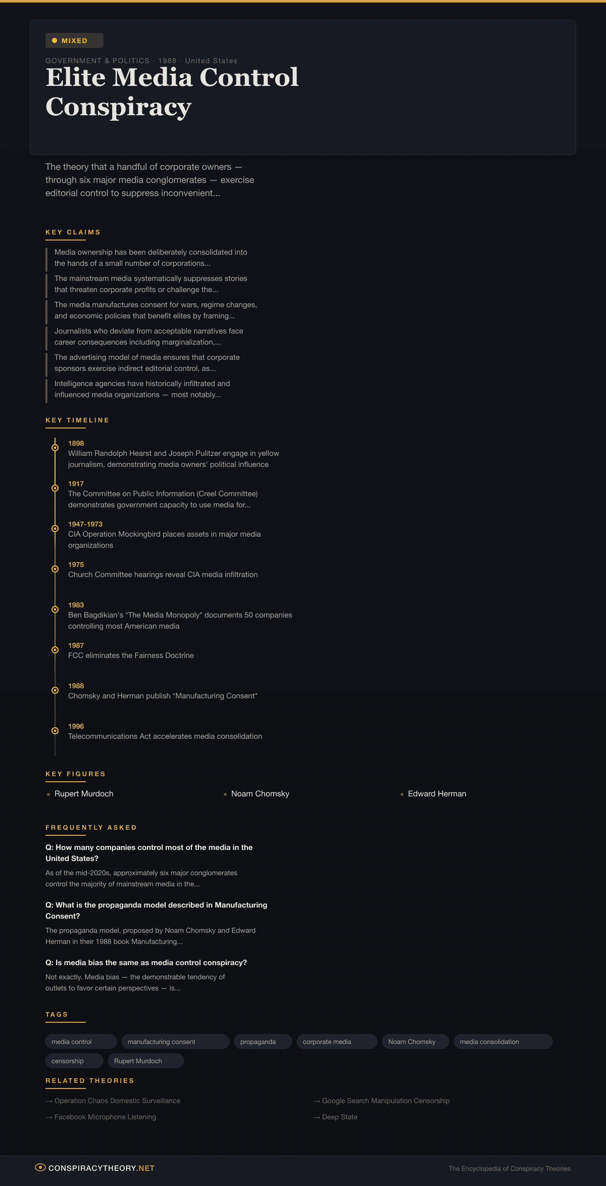 This theory exists on a spectrum. At one end, it draws on well-documented facts about media consolidation, corporate ownership, and structural bias — arguments advanced by respected academics like Noam Chomsky and Edward Herman. At the other end, it merges with more conspiratorial claims about secret cabals of media moguls coordinating to manipulate world events. The theory has gained traction across the political spectrum, with both left-wing critics focusing on corporate influence and right-wing critics alleging liberal media bias and collusion with government agencies.