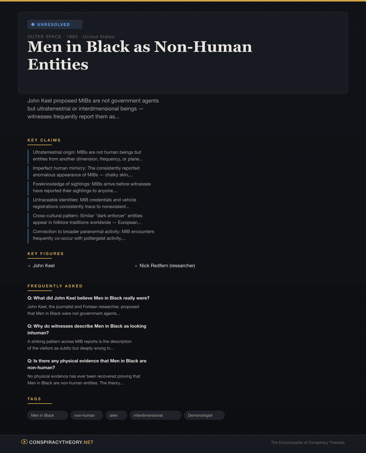 - Men in Black — UFO Witness Silencing Agents — the conventional government-agent interpretation of MIB encounters