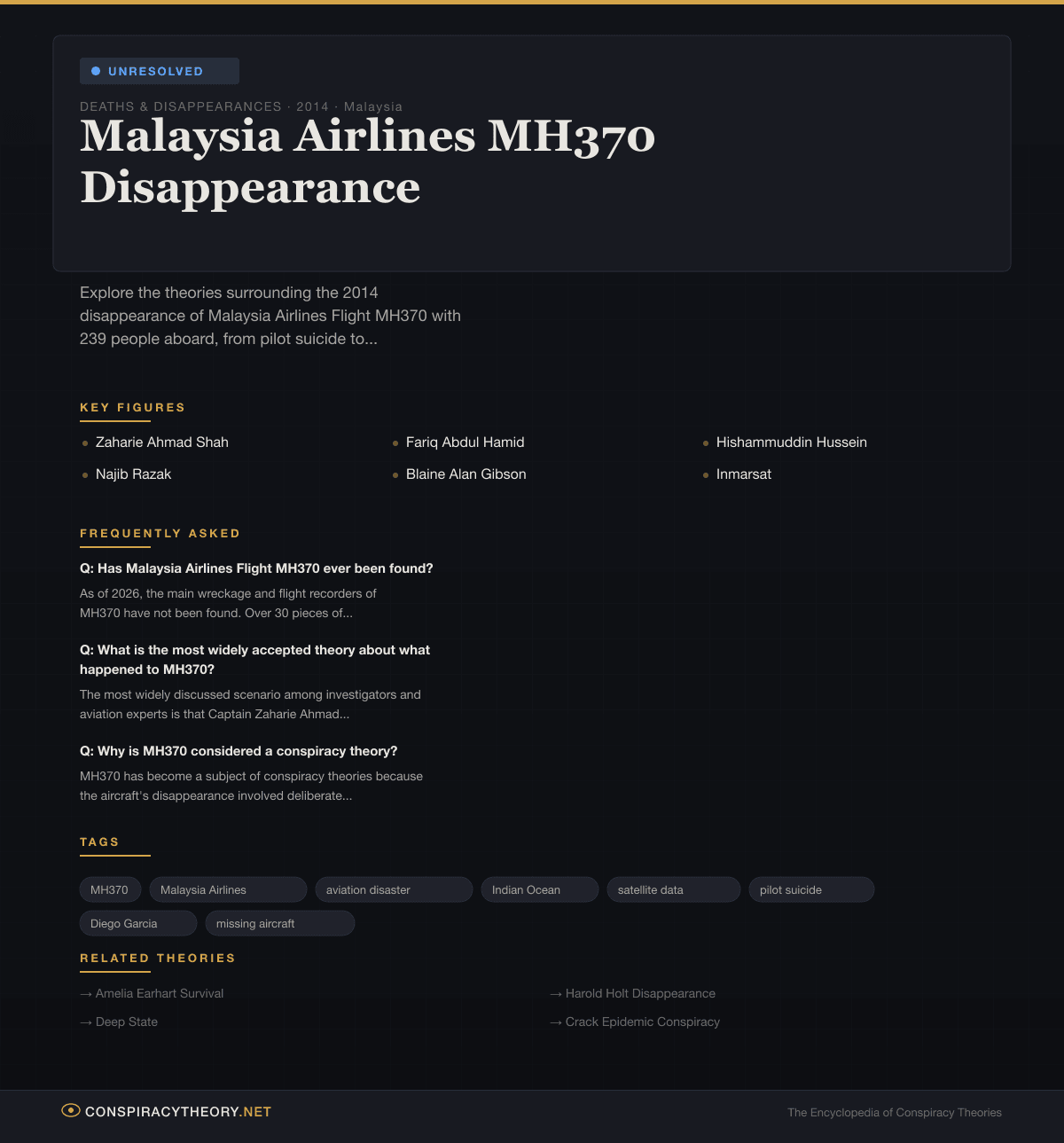 MH370 has become a subject of conspiracy theories because the aircraft's disappearance involved deliberate disabling of communication systems, unexplained course deviations, inadequate radar tracking by multiple nations, inconsistent statements by Malaysian authorities, and the failure to find the main wreckage despite years of searching. These factors have fueled theories ranging from government cover-ups and military shoot-downs to remote hijacking and secret landings at military bases.