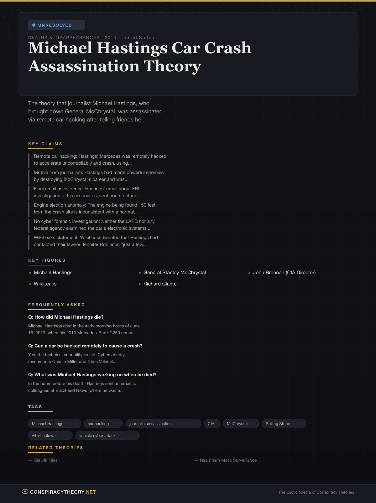 The Michael Hastings case occupies a distinctive position in the landscape of conspiracy theories because it is taken seriously by people who reject most other conspiracies. Clarke’s statement, the documented car-hacking capability, the Vault 7 revelations, and Hastings’ own documented conflict with powerful institutions give the theory a foundation that purely speculative theories lack.