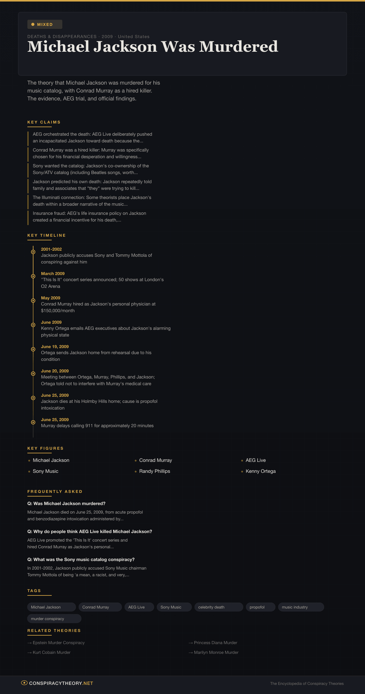 The theory is classified as mixed. Conrad Murray’s criminal negligence is a confirmed fact, and the institutional pressures surrounding Jackson’s final months are well-documented. However, the leap from negligence to deliberate murder conspiracy has not been supported by the evidence presented in either the criminal trial or the subsequent civil litigation.