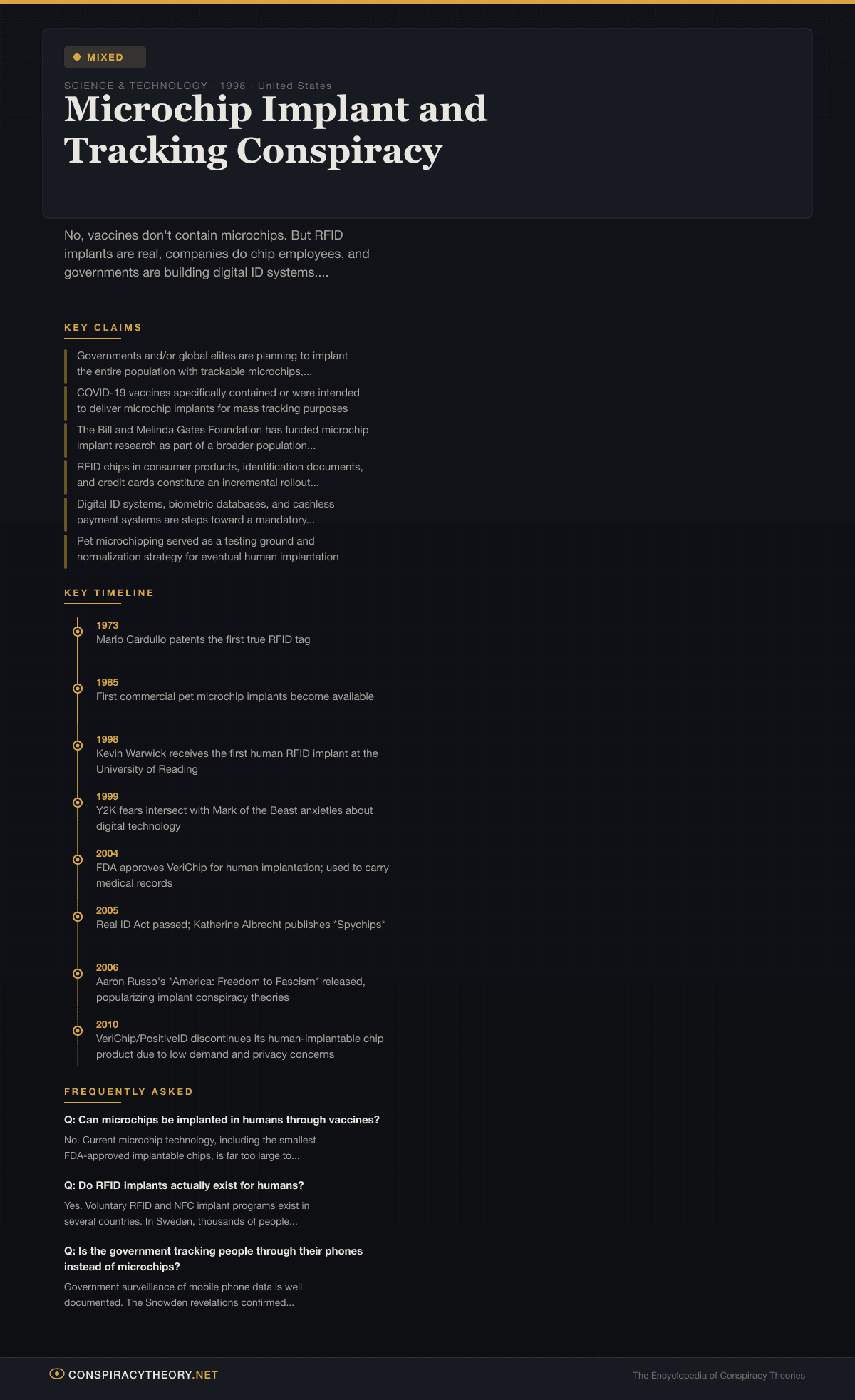 The microchip implant conspiracy theory encompasses a broad range of claims alleging that governments, corporations, or shadowy elites plan to implant tracking microchips in the global population for purposes of surveillance, behavioral control, or fulfillment of biblical prophecy. The theory has evolved significantly since its origins in the late 1990s, absorbing new technological developments and anxieties along the way, from early concerns about RFID tags in consumer products to viral claims during the COVID-19 pandemic that vaccines contained microscopic tracking devices.