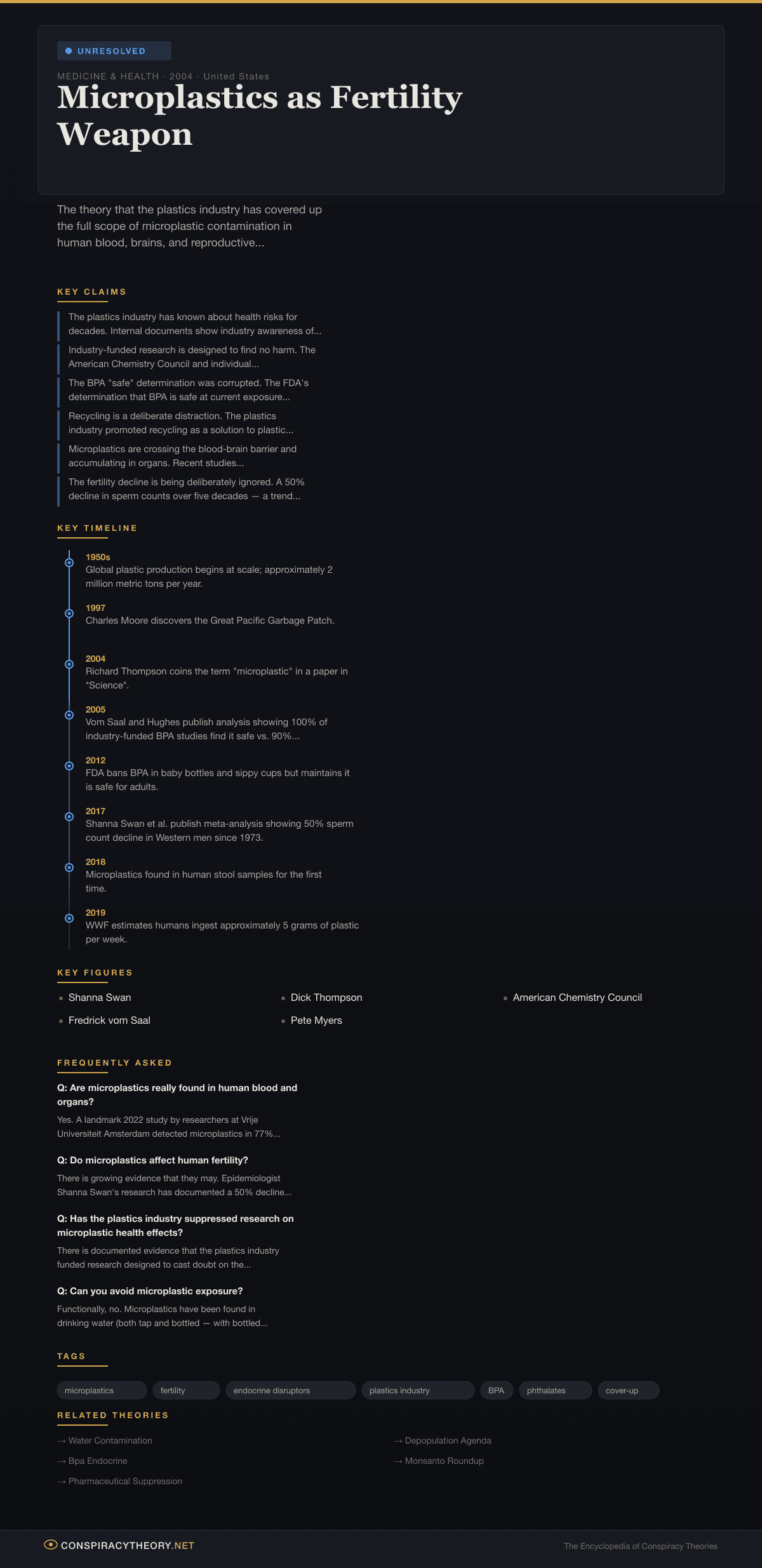Intentional depopulation. Some versions of the theory claim that microplastic contamination is a deliberate tool of population control, connecting it to the depopulation agenda conspiracy. There is no evidence for this. The plastics industry is motivated by profit, not by a desire to reduce human fertility. The contamination is a side effect of industrial activity, not a planned outcome.
